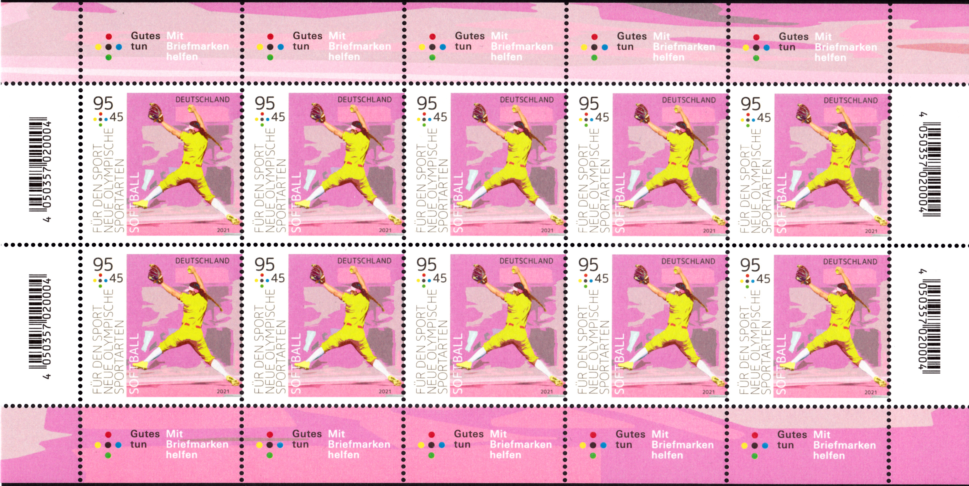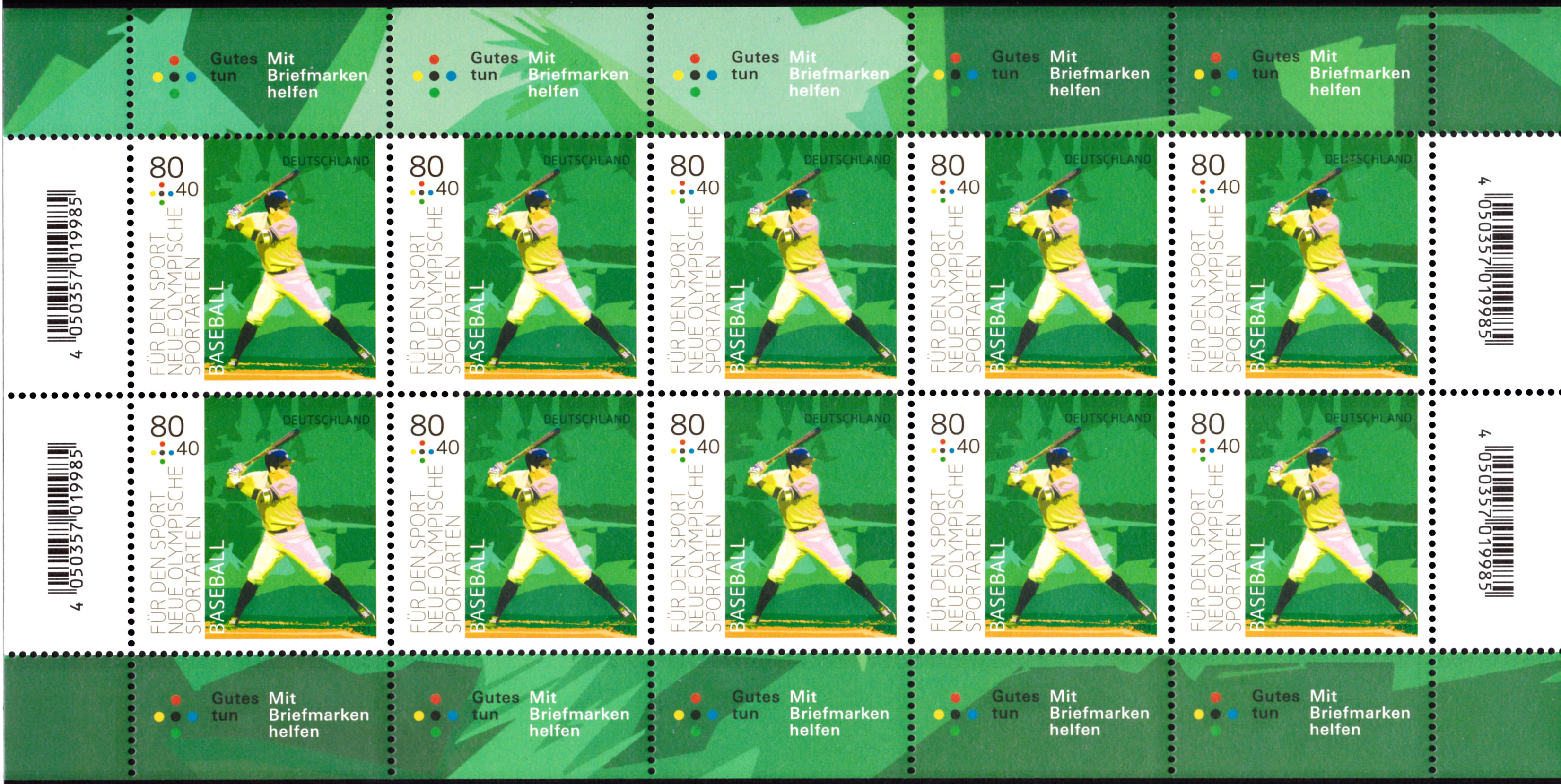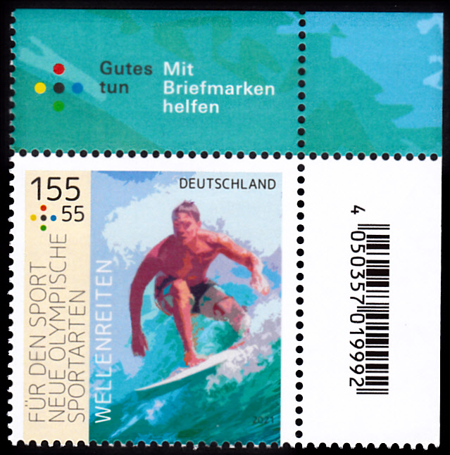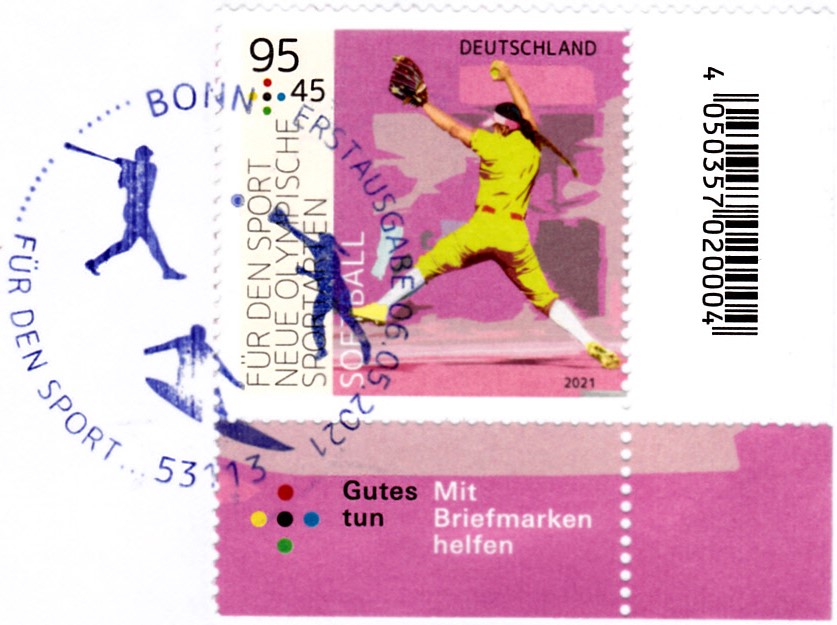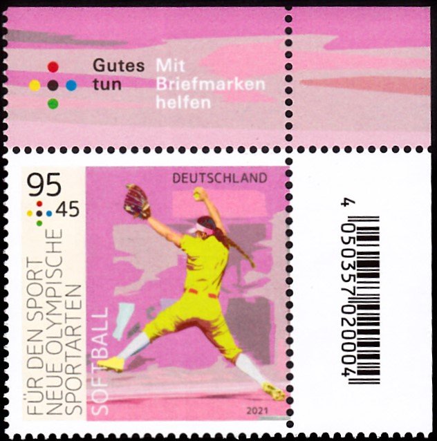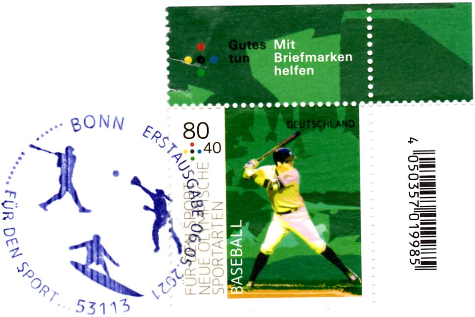 In der Serie "Für den Sport" 2021 ist bei der Deutschen Post auch eine Marke (MiNr 3602) zur neuen Olympischen Sportart Baseball erschienen. Hier zeige ich ein Eckrandstück mit EAN-Codierung.
