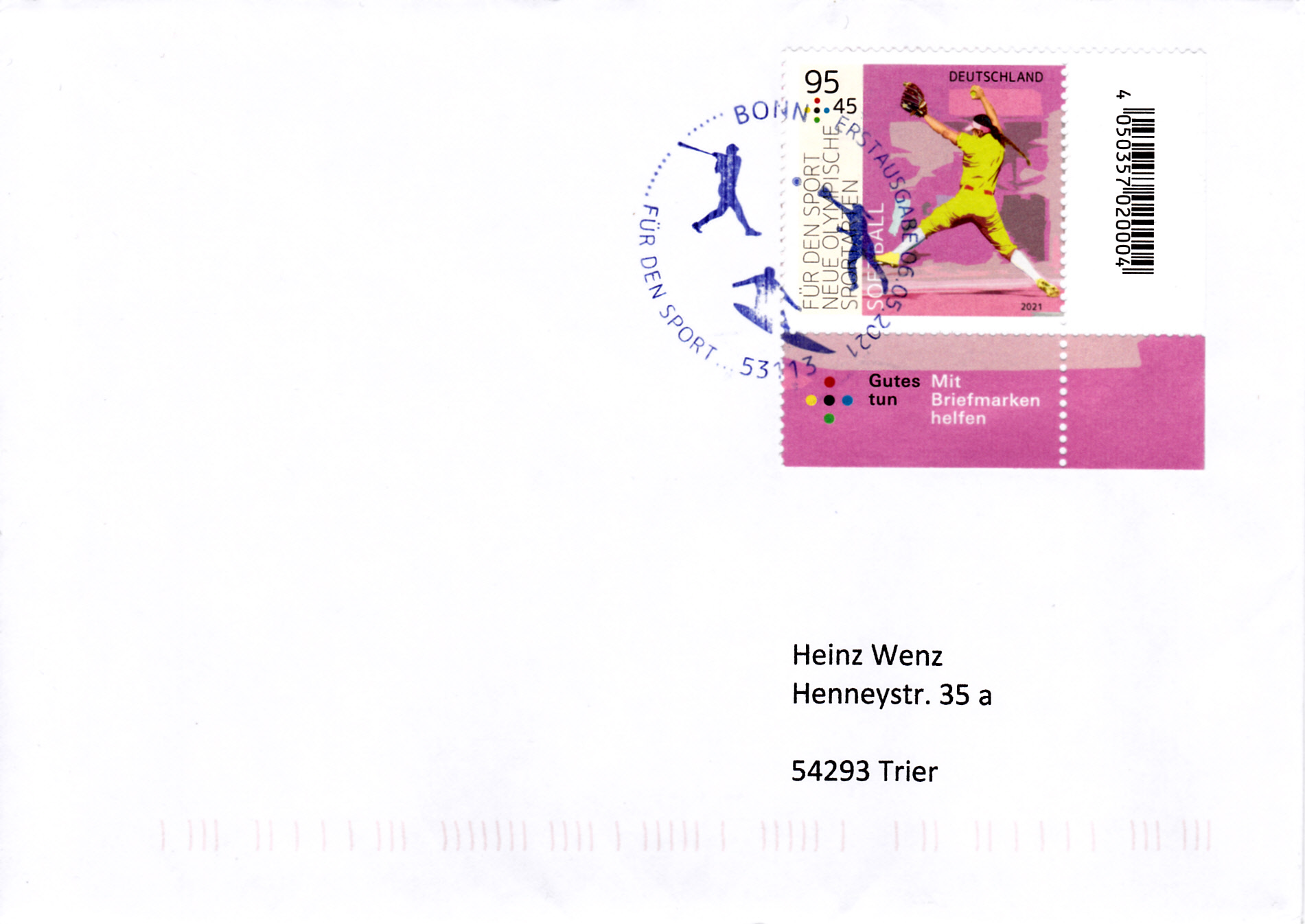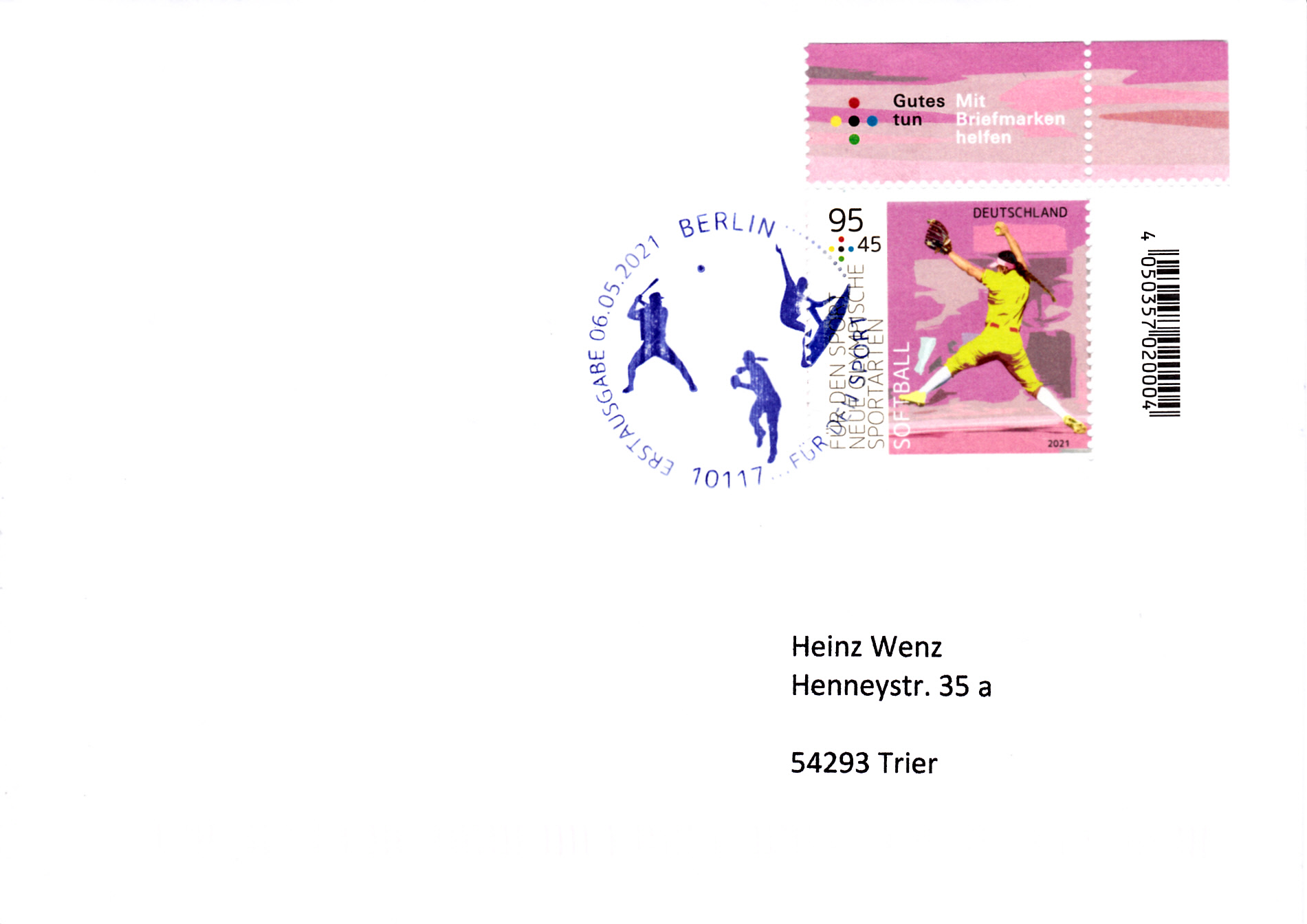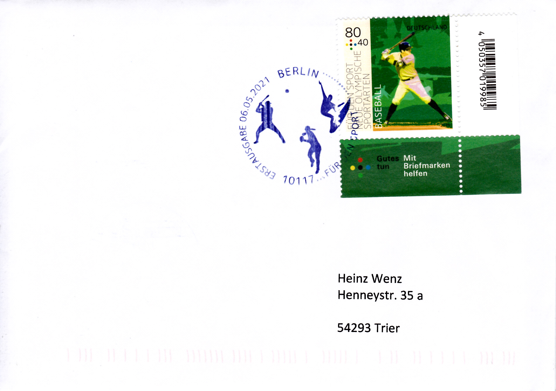 In der Serie "Für den Sport" 2021 ist bei der Deutschen Post auch eine Marke (MiNr 3602) zur neuen Olympischen Sportart Baseball erschienen. Hier zeige ich ein Eckrandstück mit EAN-Codierung.