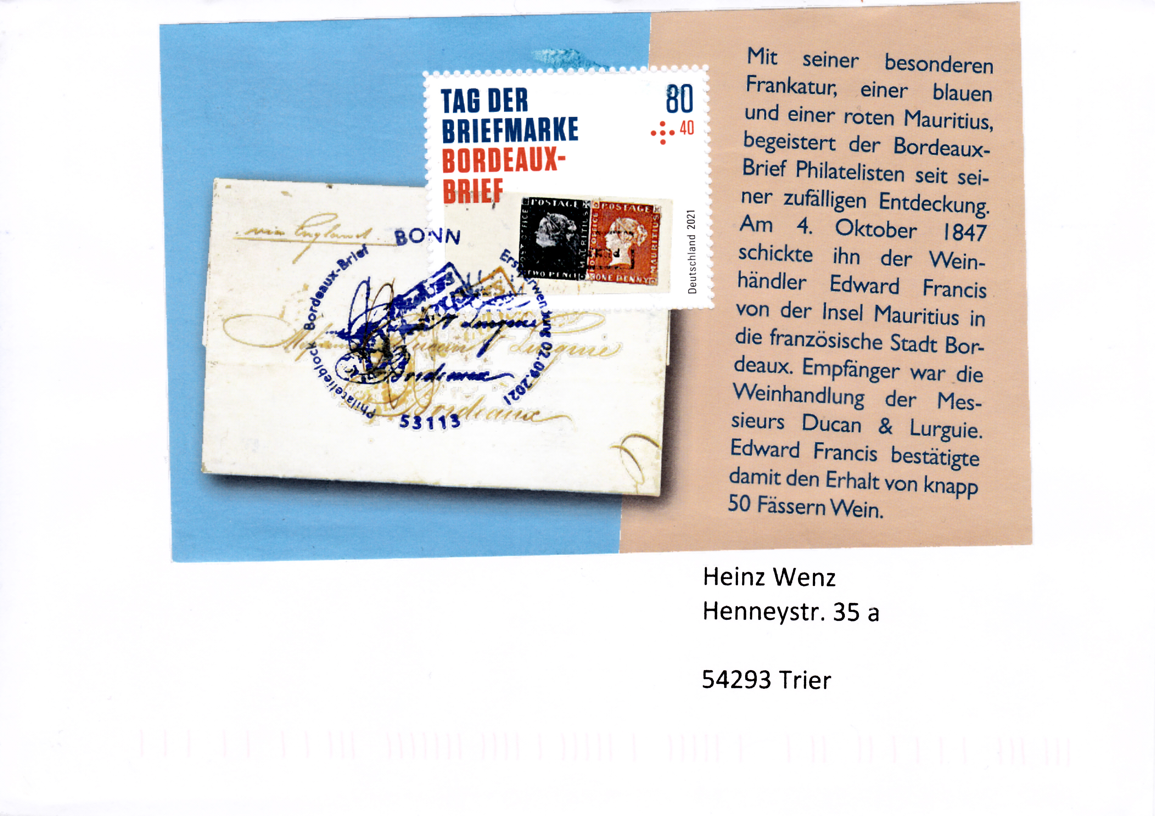 Zum Tag der Briefmarke 2021 ist bei der Deutschen Post eine Marke (MiNr 3623) mit der rechten oberen Ecke des "Bordeaux-Briefes" mit der Blauen Mauritius und der Roten Mauritius erschienen.