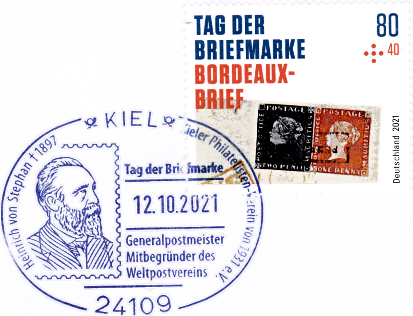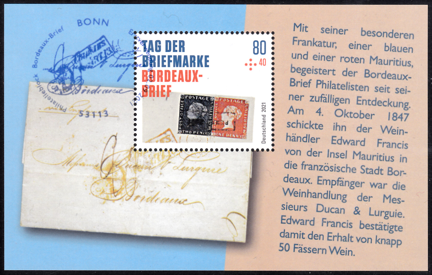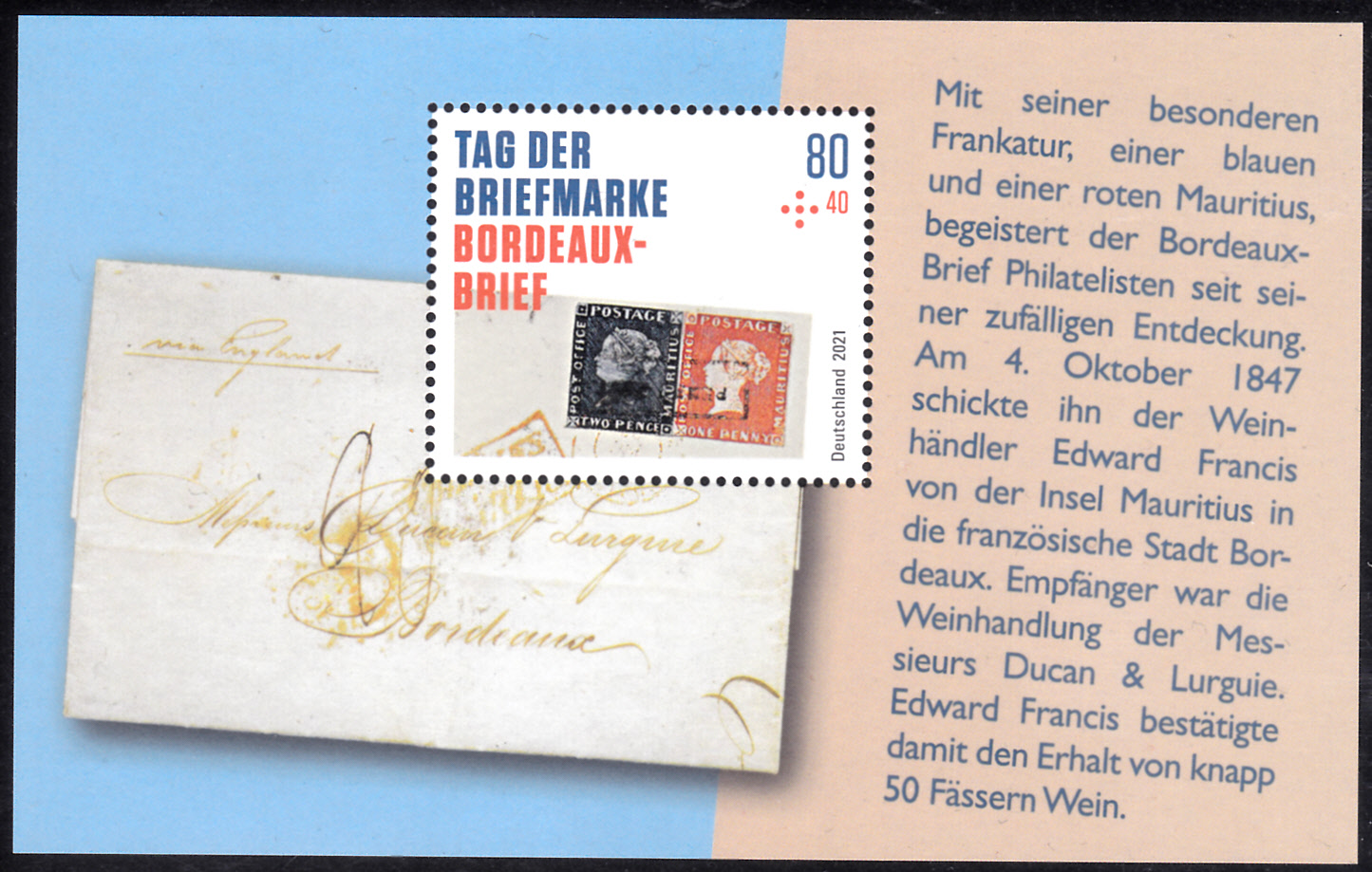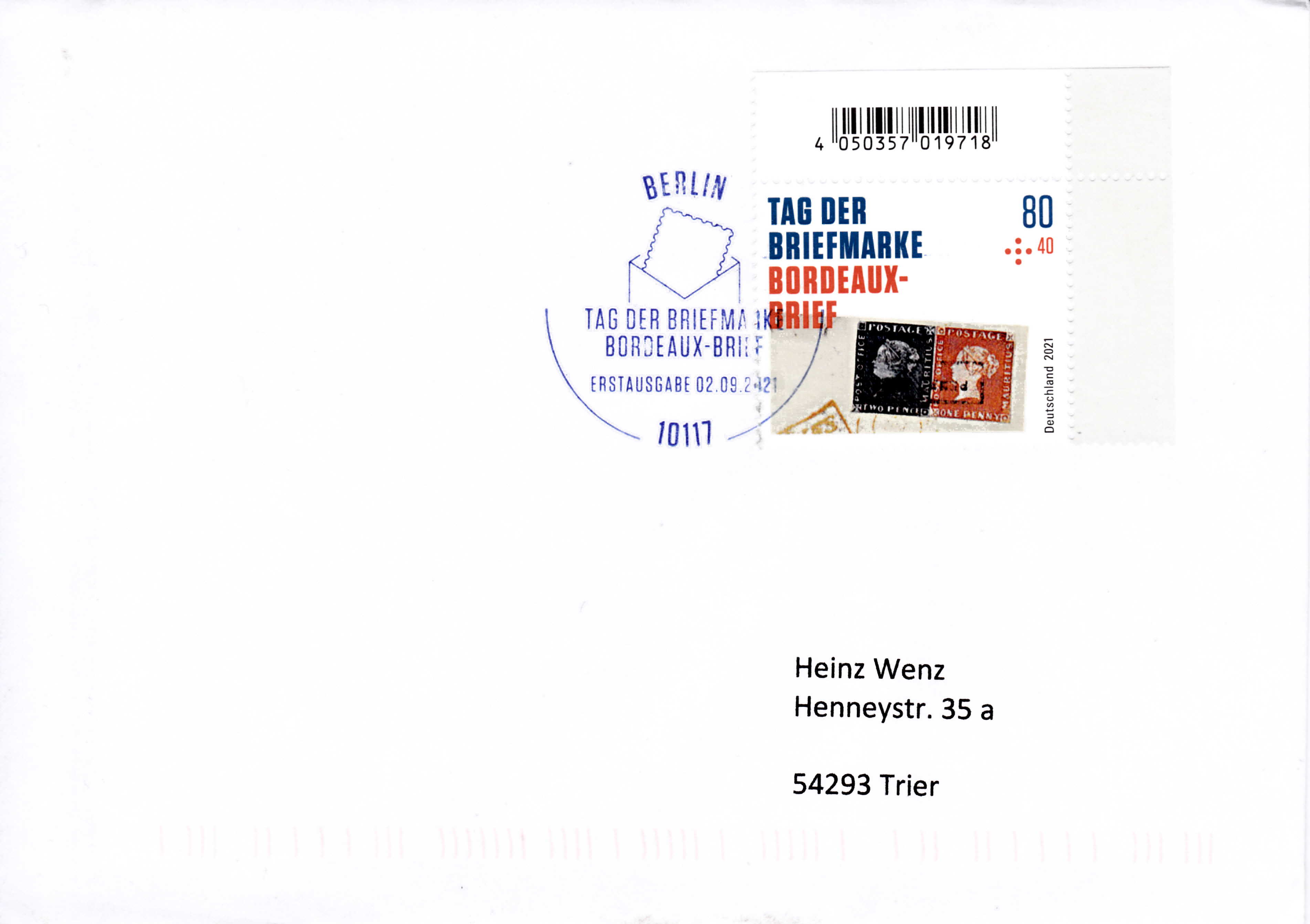 Zum Tag der Briefmarke 2021 ist bei der Deutschen Post eine Marke (MiNr 3623) mit der rechten oberen Ecke des "Bordeaux-Briefes" mit der Blauen Mauritius und der Roten Mauritius erschienen. Hier zeige ich ein Eckrandstück mit EAN-Codierung.