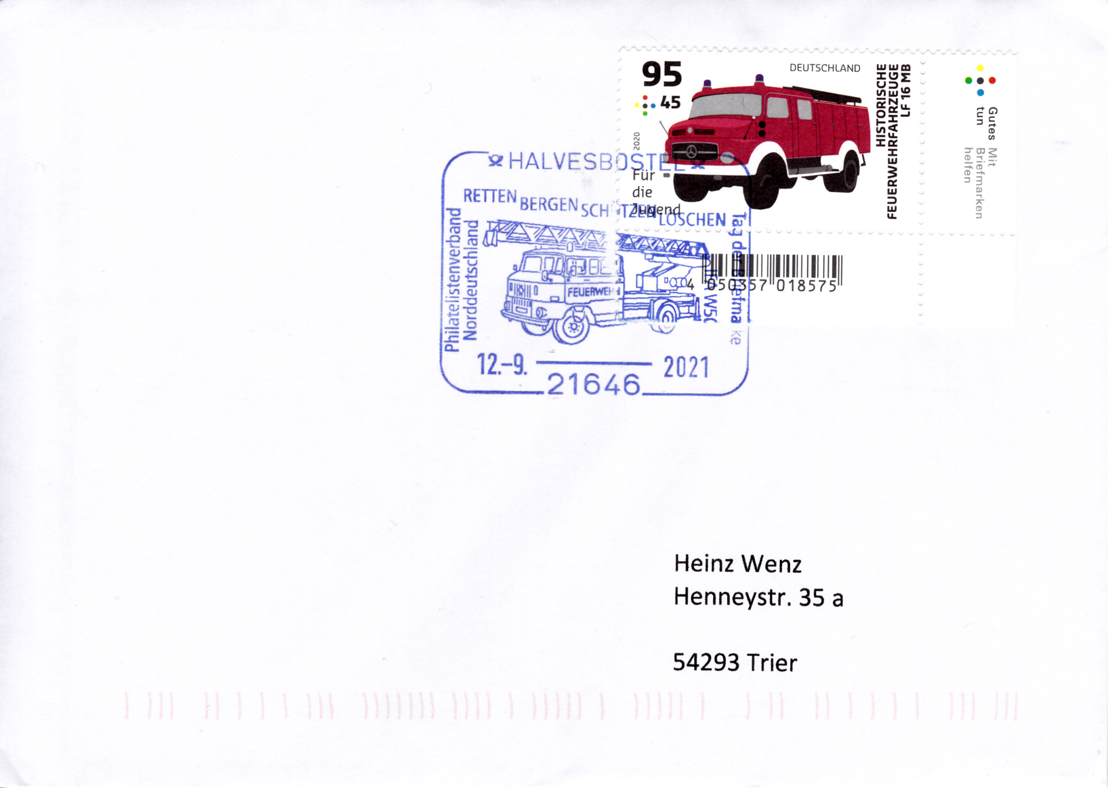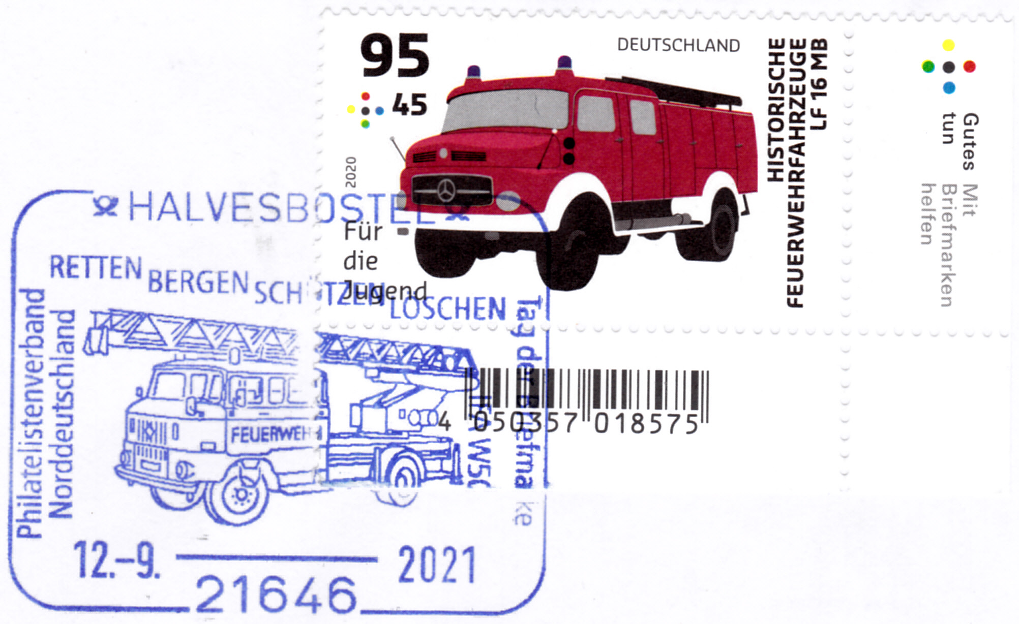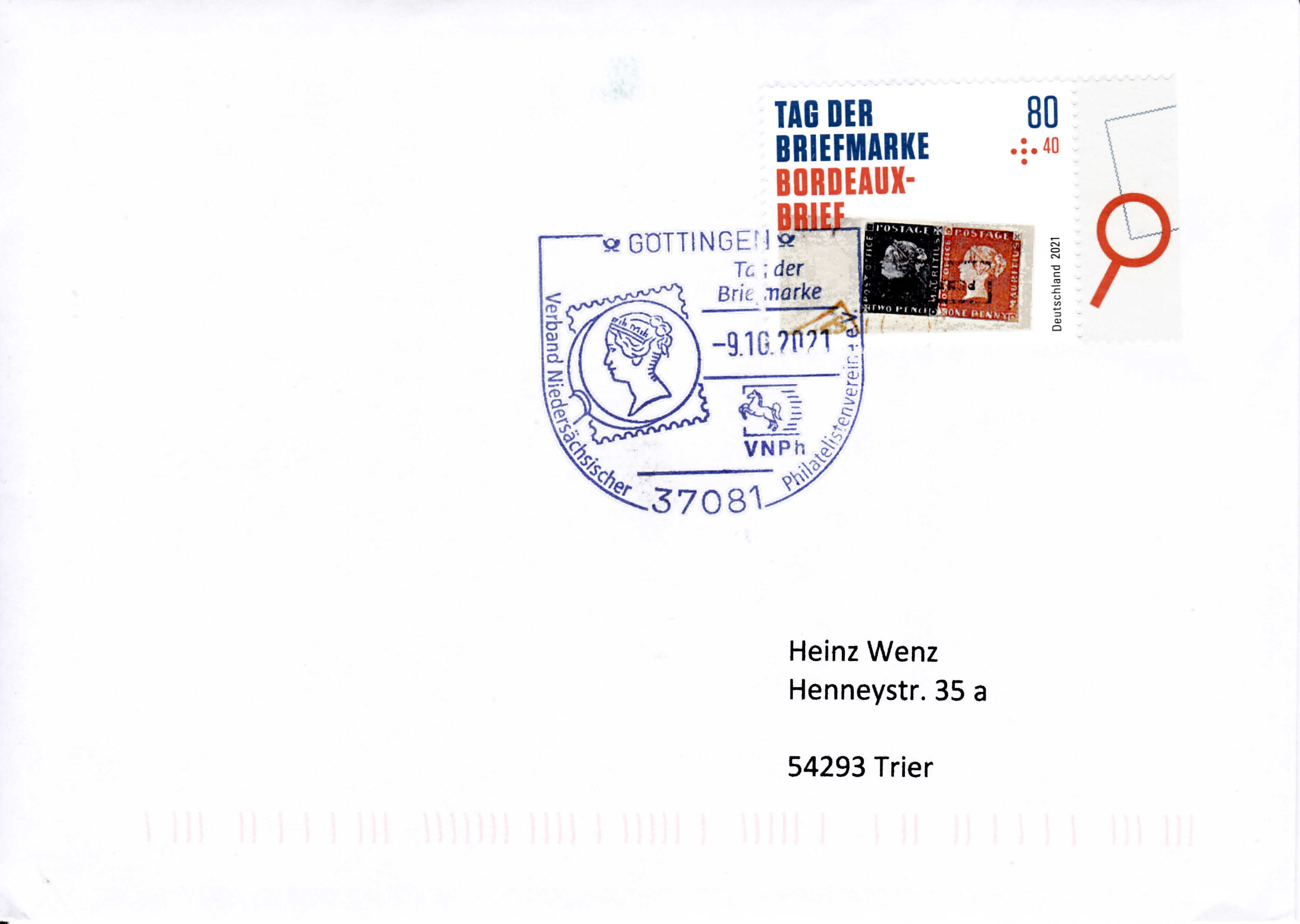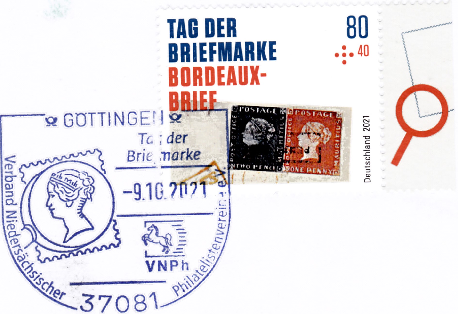 Zum Tag der Briefmarke 2021 ist bei der Deutschen Post eine Marke (MiNr 3623) mit der rechten oberen Ecke des "Bordeaux-Briefes" mit der Blauen Mauritius und der Roten Mauritius erschienen. Hier zeige ich ein Eckrandstück mit EAN-Codierung.