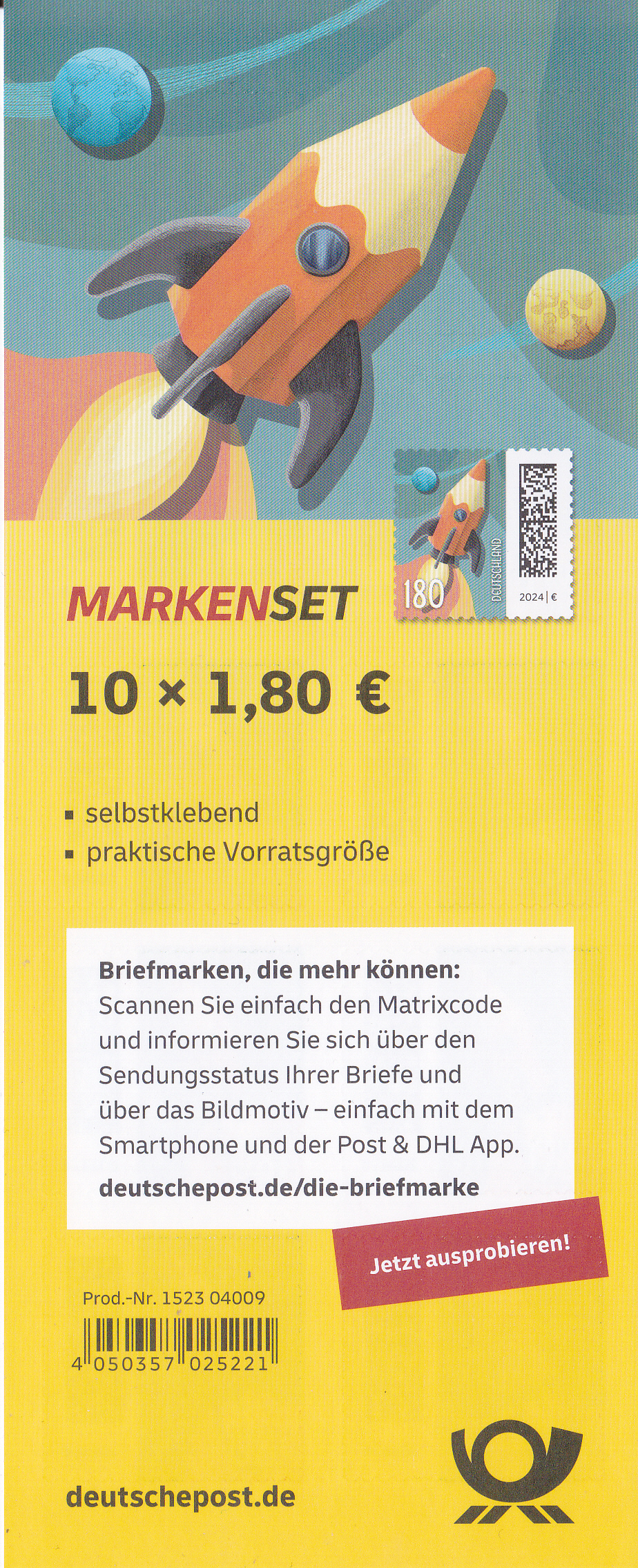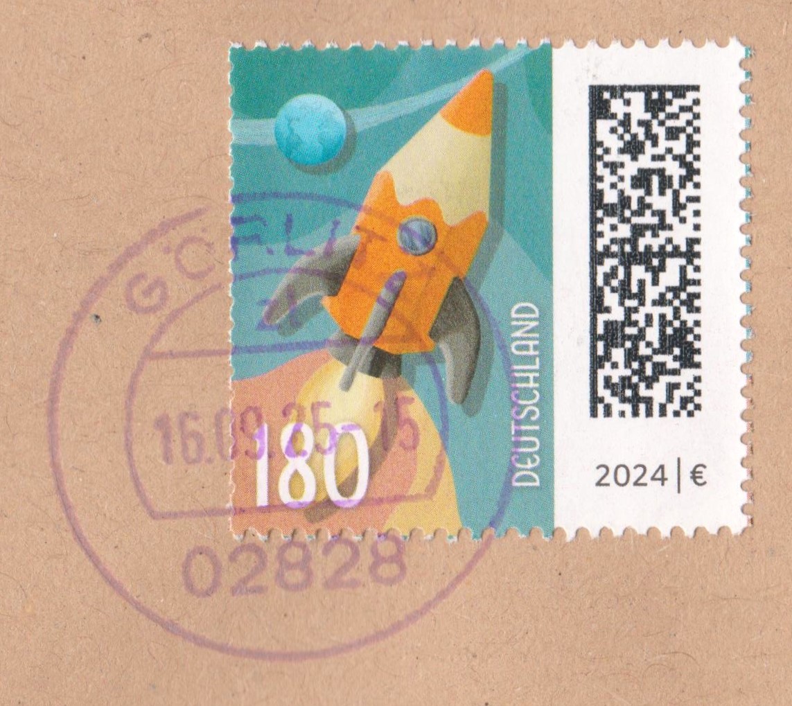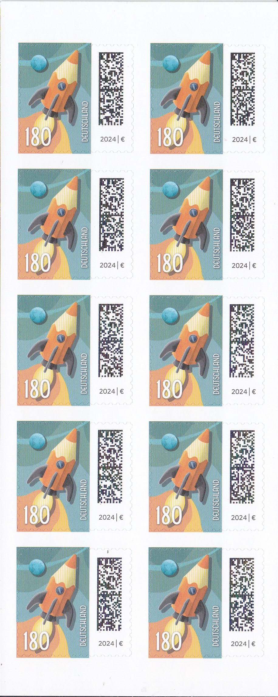 Am 5.12.2024 ist die nassklebende Marke zu 180 Cent (MiNr 3870) aus der Dauerserie "Welt der Briefe" erschienen. Sie zeigt einen "Buntstift als Rakete vor Erdball". Obwohl schon 2021 erschienen wird am Unterrand der Marke das "Ausgabejahr" mit "2022" angegeben.