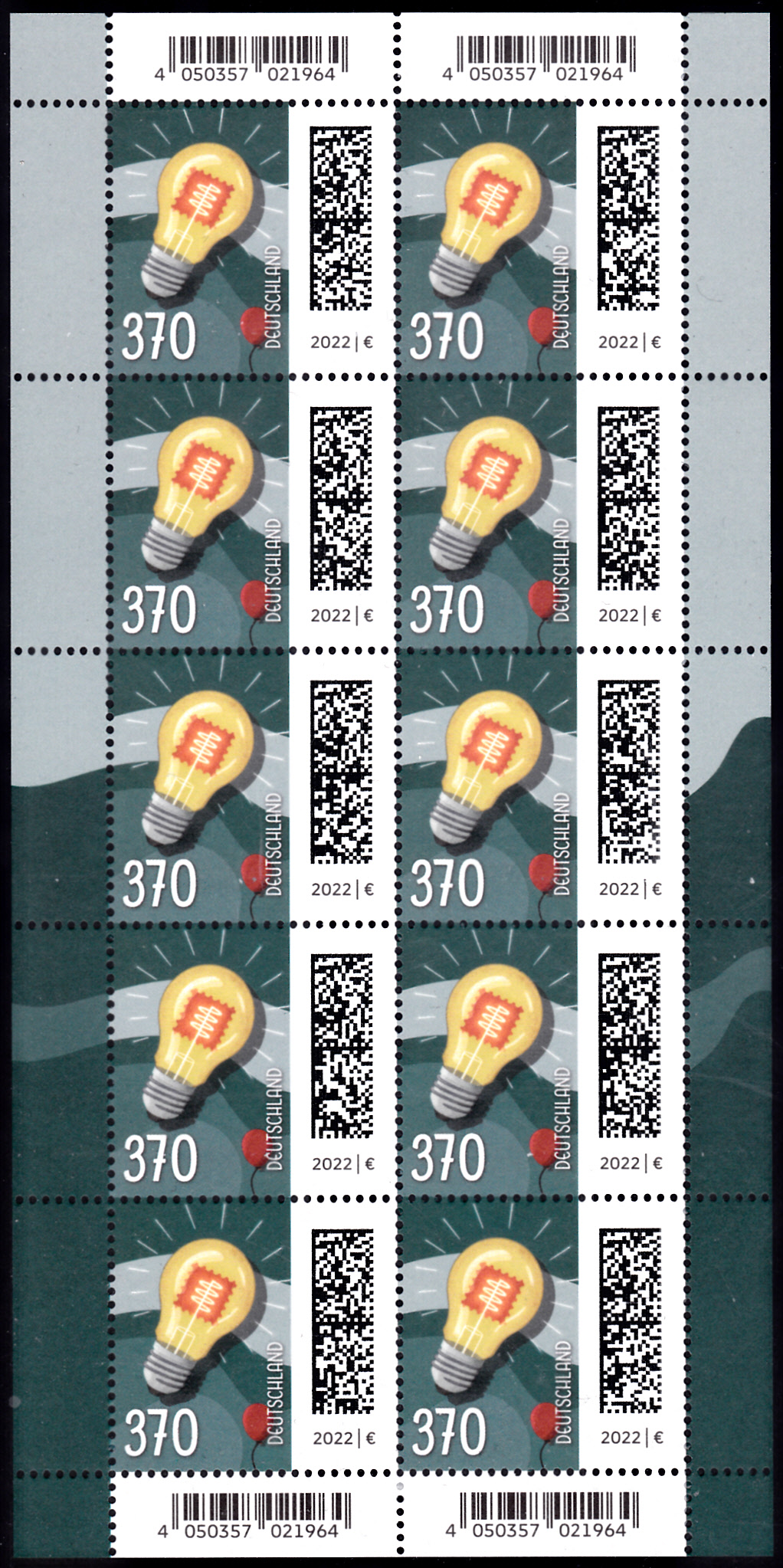 Am 1.9.2022 ist die nassklebende Marke zu 370 Cent (MiNr 3715) aus der Dauerserie "Welt der Briefe" erschienen. Sie hat das Motiv "Glühbirne mit Leuchtmarke, Luftballon". Hier zeige ich ein Randstück vom rechten oberen Eckrand mit EAN-Codierung.