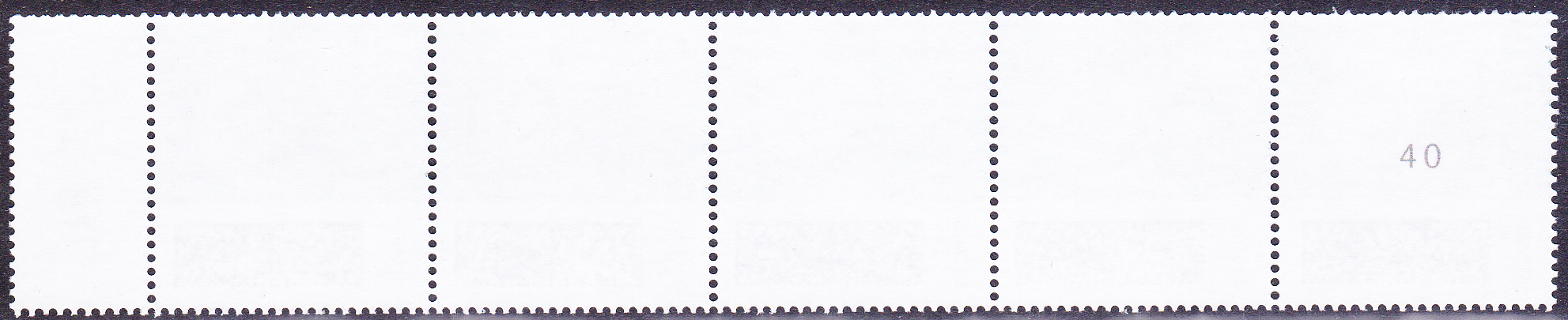 Diese Marke wurde auch in Rollen zu je 100 Marken gedruckt. Jede 5. Marke der Rollen wurde rückseitig nummeriert, auf diese folgt ein Zwischenfeld mit EAN-Codierung. Hier zeige ich einen Fünferstreifen mit dem Zwischenfeld mit EAN-Codierung.