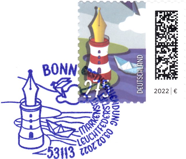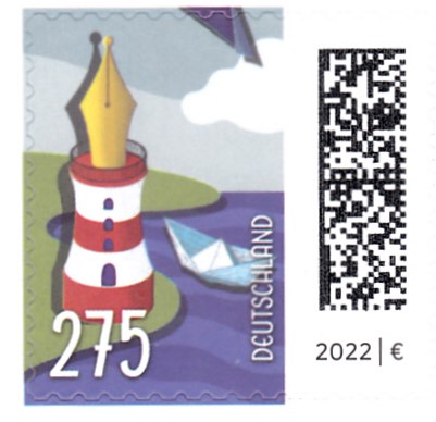 Am 3.2.2022 ist die selbstklebende Marke zu 275 Cent (MiNr 3657) aus der Dauerserie "Welt der Briefe" in einem Folienblatt und als Einzelmarke aus Folienbogen erschienen. Sie zeigt einen "Füllfederhalter als Leuchtturm" und ein "Papierschiff".