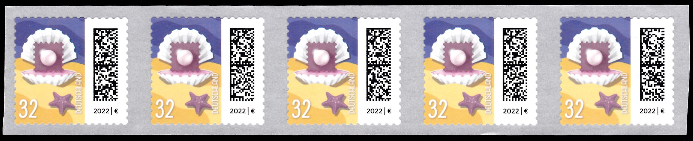 Am 4.8.2022 ist die nassklebende Marke zu 32 Cent (MiNr 3802) aus der Dauerserie "Welt der Briefe" erschienen. Sie zeigt eine "Muschel mit Perlen-Briefmarke".