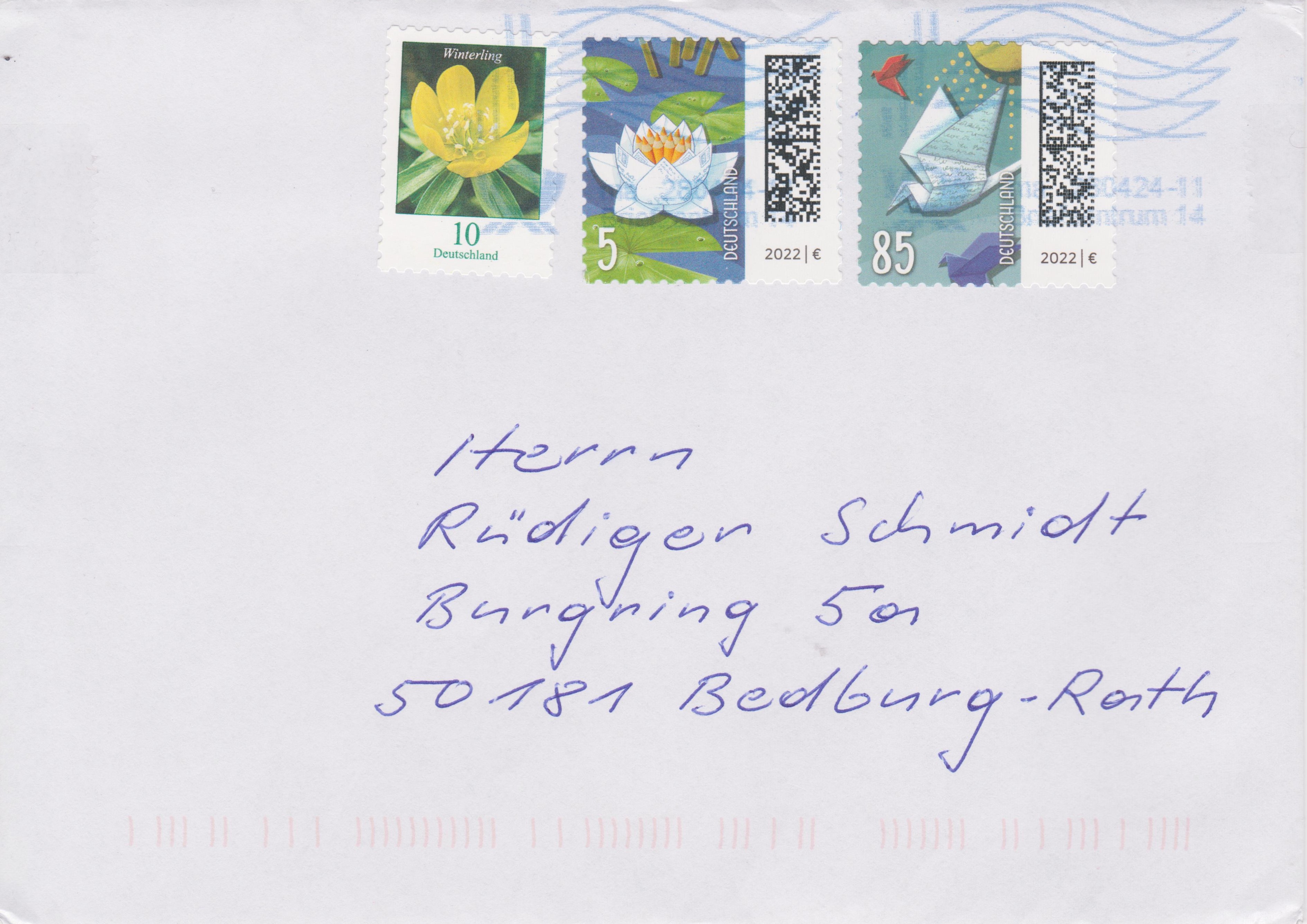 Kompaktbrief, Portostufe 1 €, am 28.04.2024 dargestellt als Mischfrankatur von drei selbstklebenden Postwertzeichen: