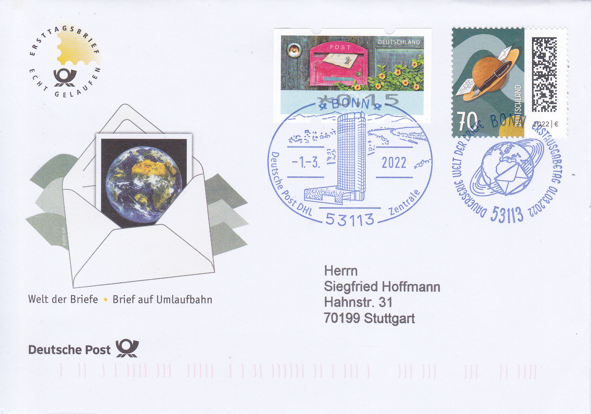 Ersttagsbrief der Deutschen Post (wurde im Abo bei der Post bezogen) mit einer nassklebenden Marke zu 70 Cent mit dem Ersttagstempel Bonn und der Zusatzfrankatur einer Automatenmarke zu 15 Cent mit einem Stempel der Deutschen Post DHL Zentrale in Bonn.