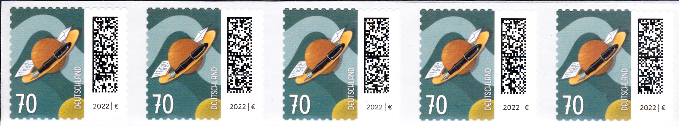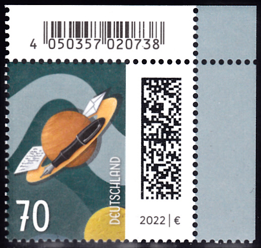 Am 1.3.2022 ist die nassklebende Marke zu 70 Cent (MiNr 3670) aus der Dauerserie "Welt der Briefe" erschienen. Sie zeigt die Abbildung "Briefe und Füller umkreisen Saturn".