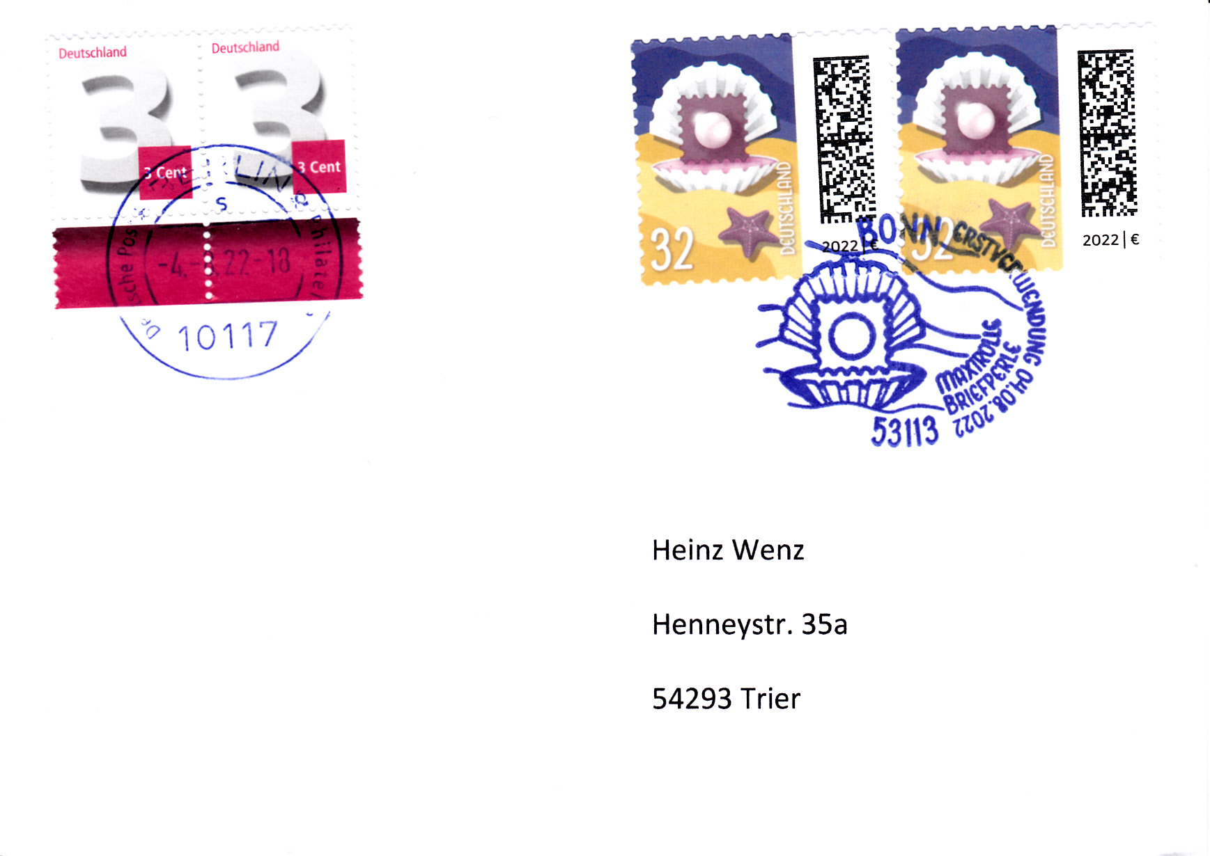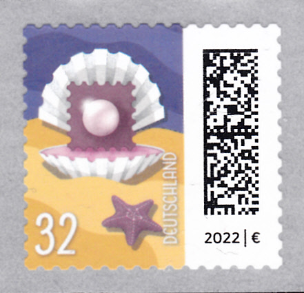 Am 4.8.2022 ist die nassklebende Marke zu 32 Cent (MiNr 3802) aus der Dauerserie "Welt der Briefe" erschienen. Sie zeigt eine "Muschel mit Perlen-Briefmarke".
