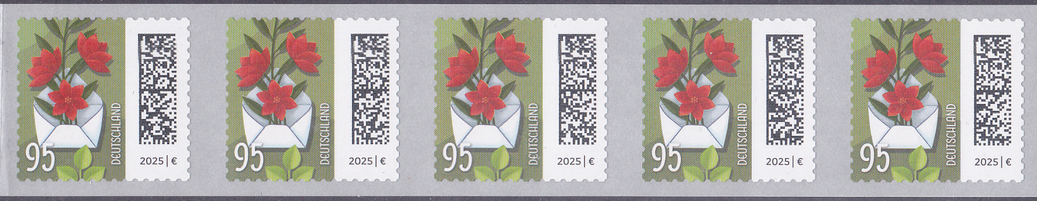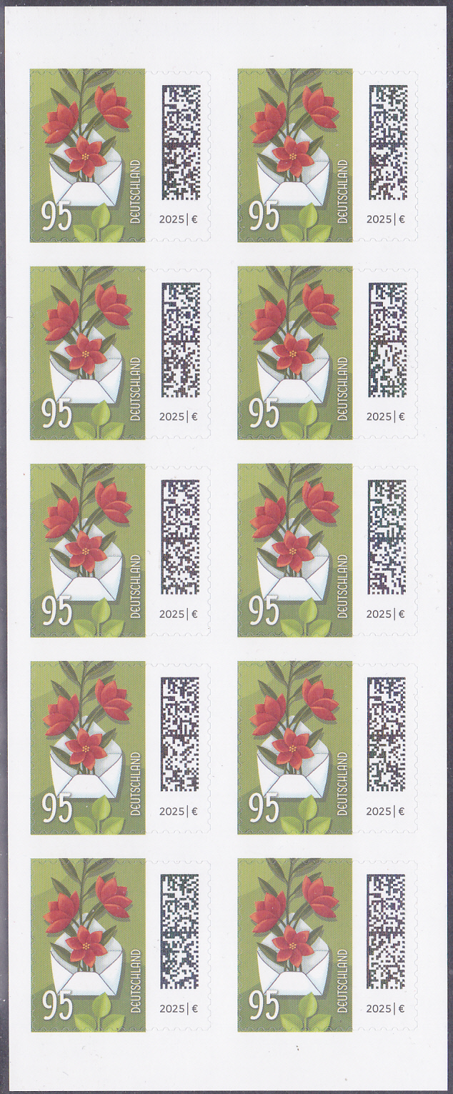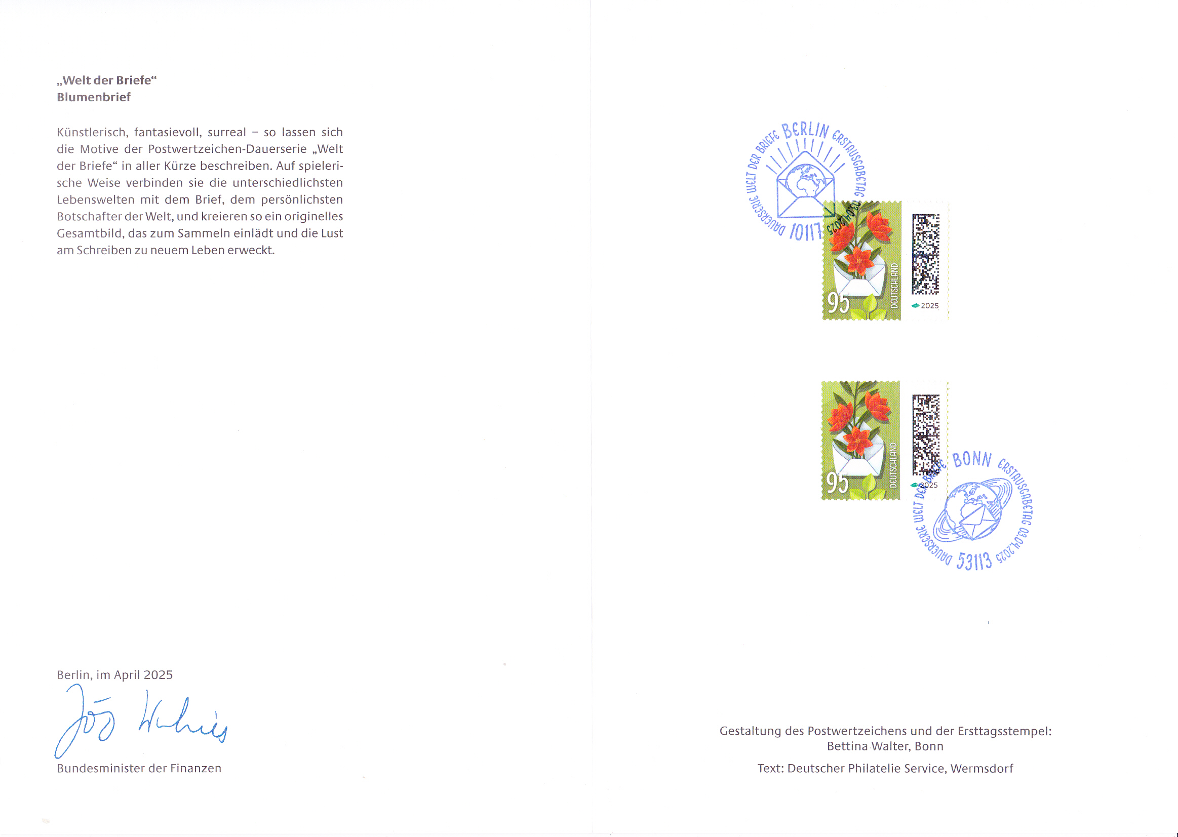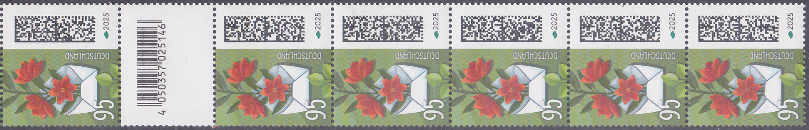 Am 3.4.2025 ist die nassklebende Marke zu 95 Cent (MiNr 3898) aus der Dauerserie "Welt der Briefe" erschienen. Sie zeigt "Briefumschlag mit orangefarbenem Milchstern (Ornithogalum dubium)". Da es bereits eine Marke zur Portostufe 95 Cent in diese Serie gab, ist dies eigentlich eine unsinnige Ausgabe der Deutschen Post!!
