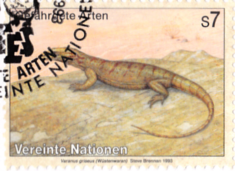 In der Serie "Gefährdete Arten Fauna" erschien bei der Postverwaltung der Vereinte Nationen Wien 1993 diese Marke (MiNr 145) mit einem Wüstenwaran (Varanus griseus).