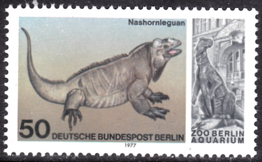 In Berlin ist eine Marke (MiNr 555) zum 25. Jahrestag der Wiedereröffnung des Aquariums im Berliner Zoo mit einem Nashornleguan (Cyclura cornuta) erschienen.