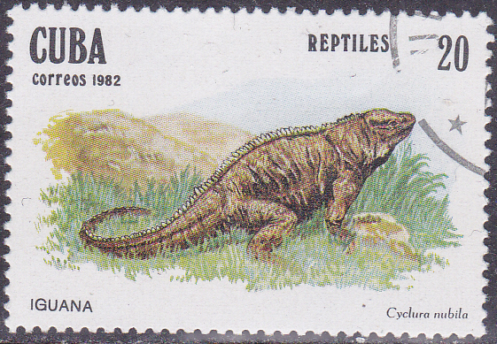 Eine Marke aus Kuba (MiNr 2670) stellt uns einen Kubanischen Felsenleguan (Cyclura nubila) vor. Michel nennt ihn Kuba-Wirtelschwanzleguan (Cyclura nubila).