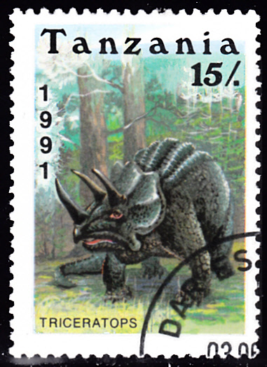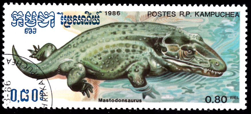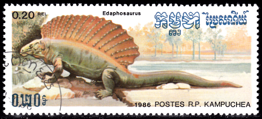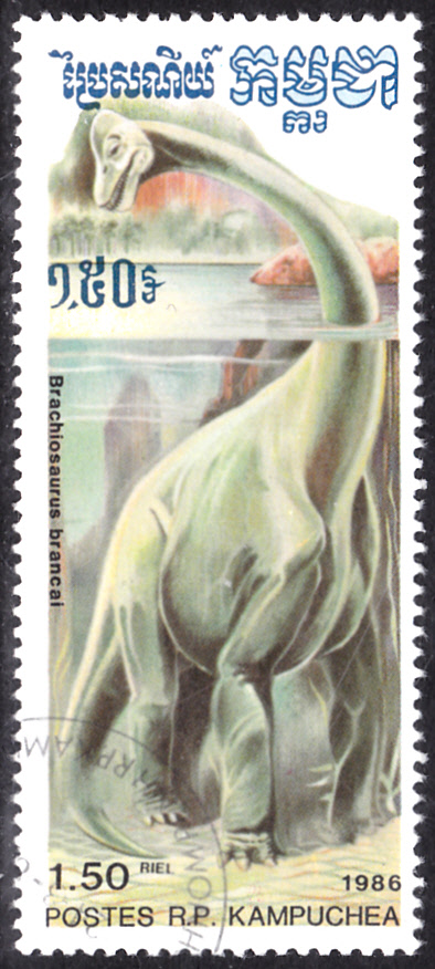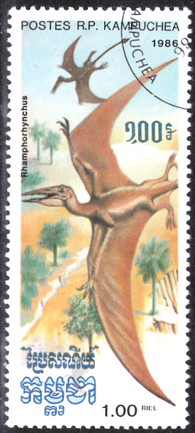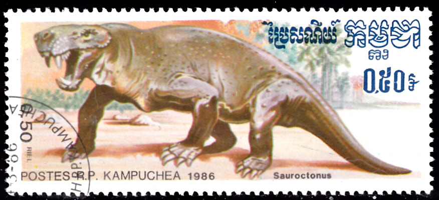 In der gleichen Serie "Prähistorische Tiere" aus Kambodscha erschien diese Marke (MiNr 742) mit einem Sauroctonus.