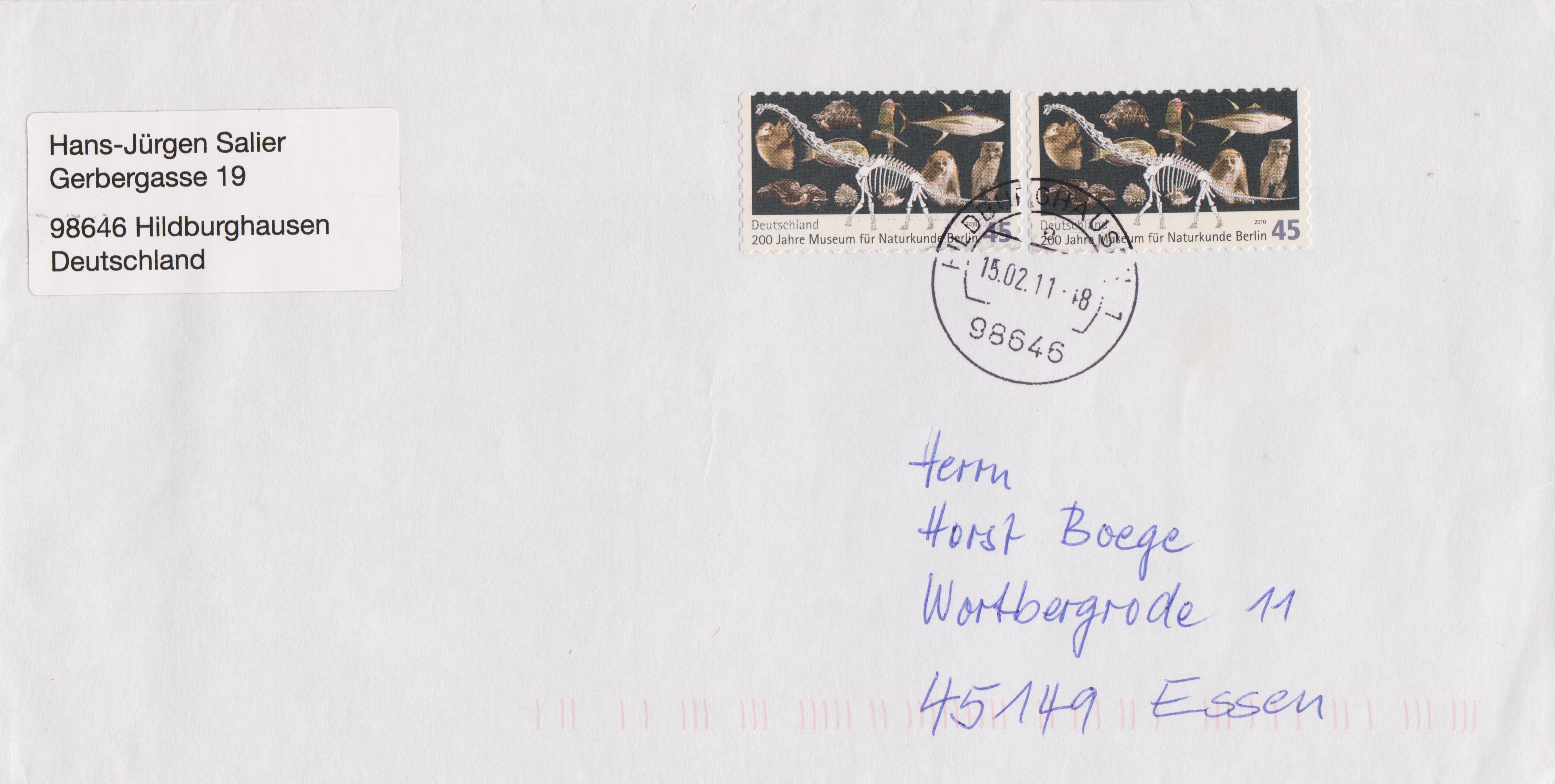 Bedarfsbrief vom 15.02.2011, portorichtig als Brief der zweiten Gewichtsstufe mit 90 Cents frankiert: