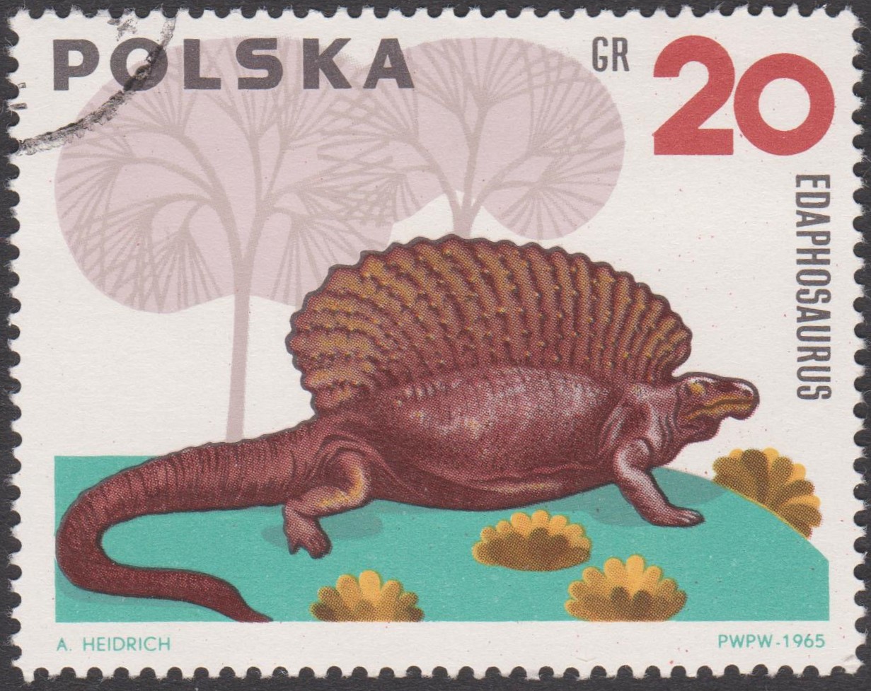 Polen MiNr. 1570 zeigt einen Edaphosaurus („Pflaster-Echse“, zu gr. edaphos - Pflaster, Boden; sauros - Echse), eine ausgestorbene Gattung der Pelycosaurier (Pelycosauria). Edaphosaurus gehörte zu den ersten bekannten Landwirbeltieren, die sich von Pflanzen ernährten. Sie ähnelten in ihrem echsenartigen Aussehen den heutigen Waranen und Leguanen.