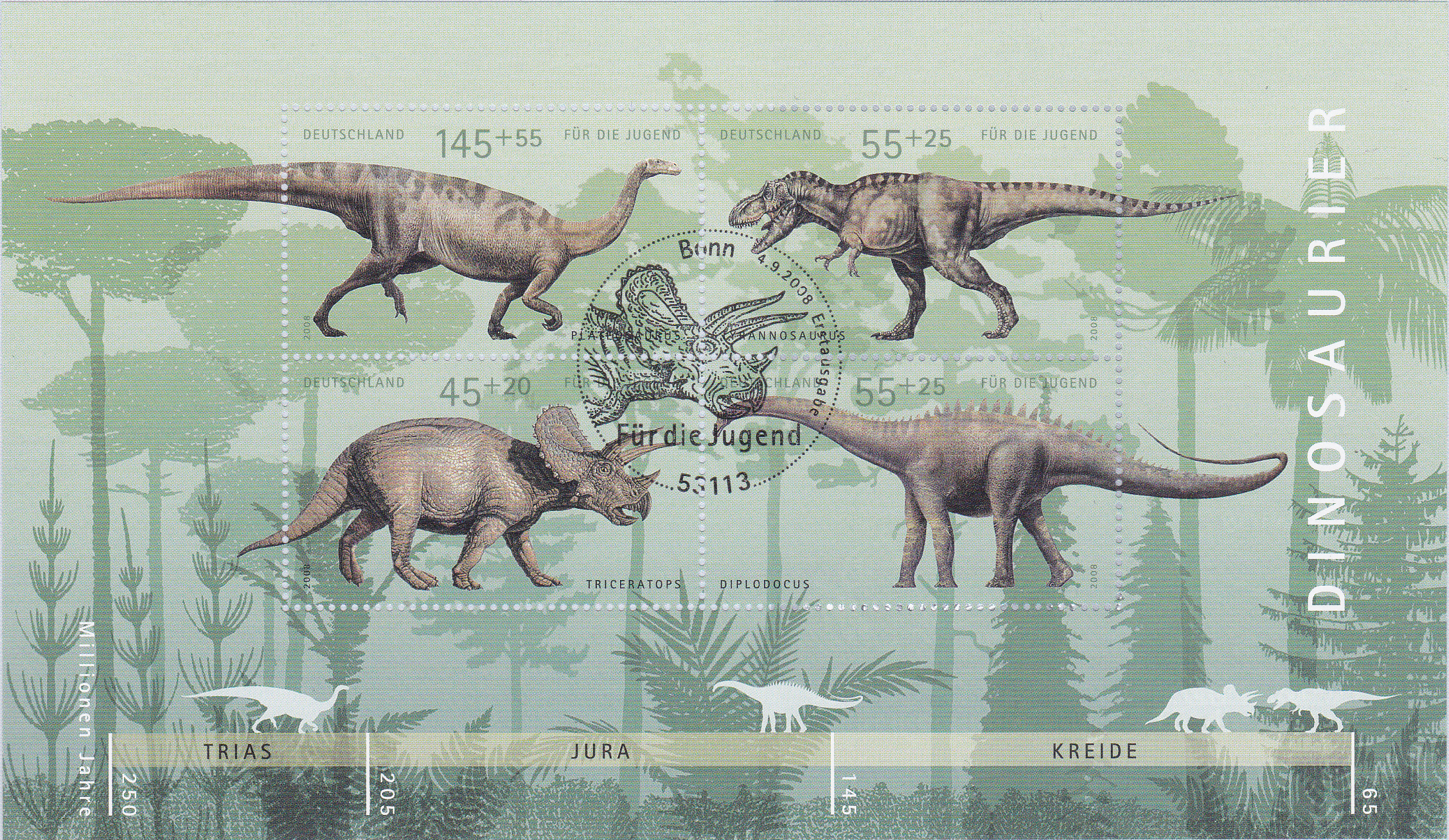 Für die selbstklebende Marke zum Jubiläum "200 Jahre Museum für Naturkunde in Berlin" (MiNr. 2780) mit dem Skelett eines Brachiosaurus brancai wurde in Bonn auch ein Erstverwendungsstempel eingesetzt.