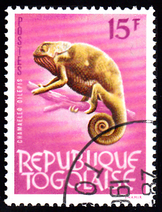 Diese Marke aus Togo (MiNr 394) stellt uns ein Lappenchamäleon (Chamaeleo dilepis) vor.