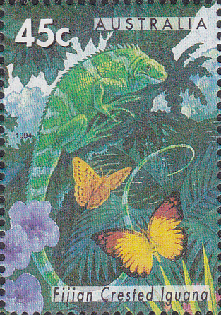 Auf der Bildseite einer Ganzsachenpostkarte der australischen Post wird eine hier bereits gezeigte Marke aus Australien (MiNr 1428) auch zusammen mit einem Foto von einem Kurzkammleguan (Brachylophus vitiensis) abgebildet.