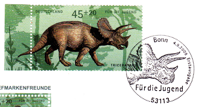 Die Jugendmarke 2008 zu 45+20 Cent /MiNr 2687) aus dem Block 73 der Deutschen Post zeigt den Triceratops im Markenbild. Im Ersttagsstempel Bonn vom 4.9.2008 ein Triceratops-Kopf zu sehen.