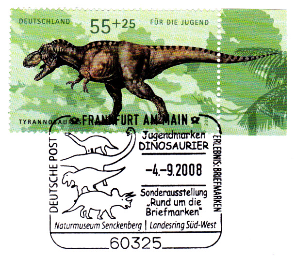 Zu einer Ausstellung "Rund um die Briefmarke" des Landesringes Südwest der DPhJ wurde bei einer SoPoFi im Senckenberg Museum Frankfurt am 4.9.2008 (Ersttag des Jugendmarkenblockes) ein Sonderstempel geführt, der im Stempelbild die vier Saurierarten, die auf den Marken des Blockes zu sehen sind abbildet: Plateosaurus, Tyrannosaurus, Triceratops und Diplodocus, abbildet.