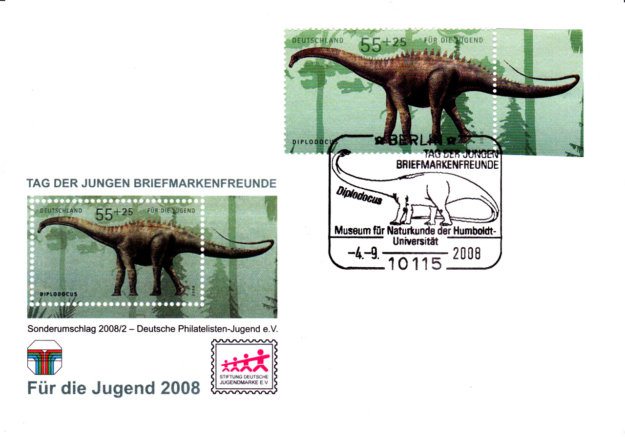 Der zweite Wert zu 55+25 Cent (MiNr 2689) des Blockes mit den Jugendmarken 2008 zeigt einen Diplodocus im Markenbild. Dazu passend gab es einen Sonderumschlag der DPhJ und einen Sonderstempel zum Tag der Jungen Briefmarkenfreunde am Erstag (4.9.2008) in Berlin im Museum für Naturkunde der Humboldt-Universität. Leider ist auch dieser Beleg nicht echt gelaufen.