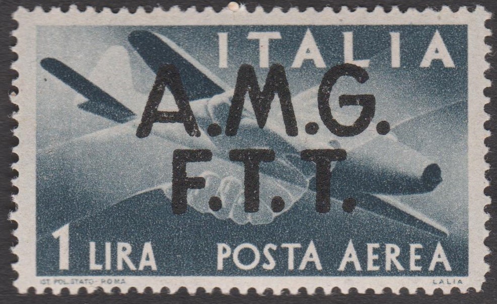 Triest - Zone A MiNr. 18, Italien MiNr. 706 mit Aufdruck "A.M.G. P.T.T." (= Allied Military Government Free Territory Trieste), erschien am 01.10.1947 in einer Auflage von 1.200.000 Stück: