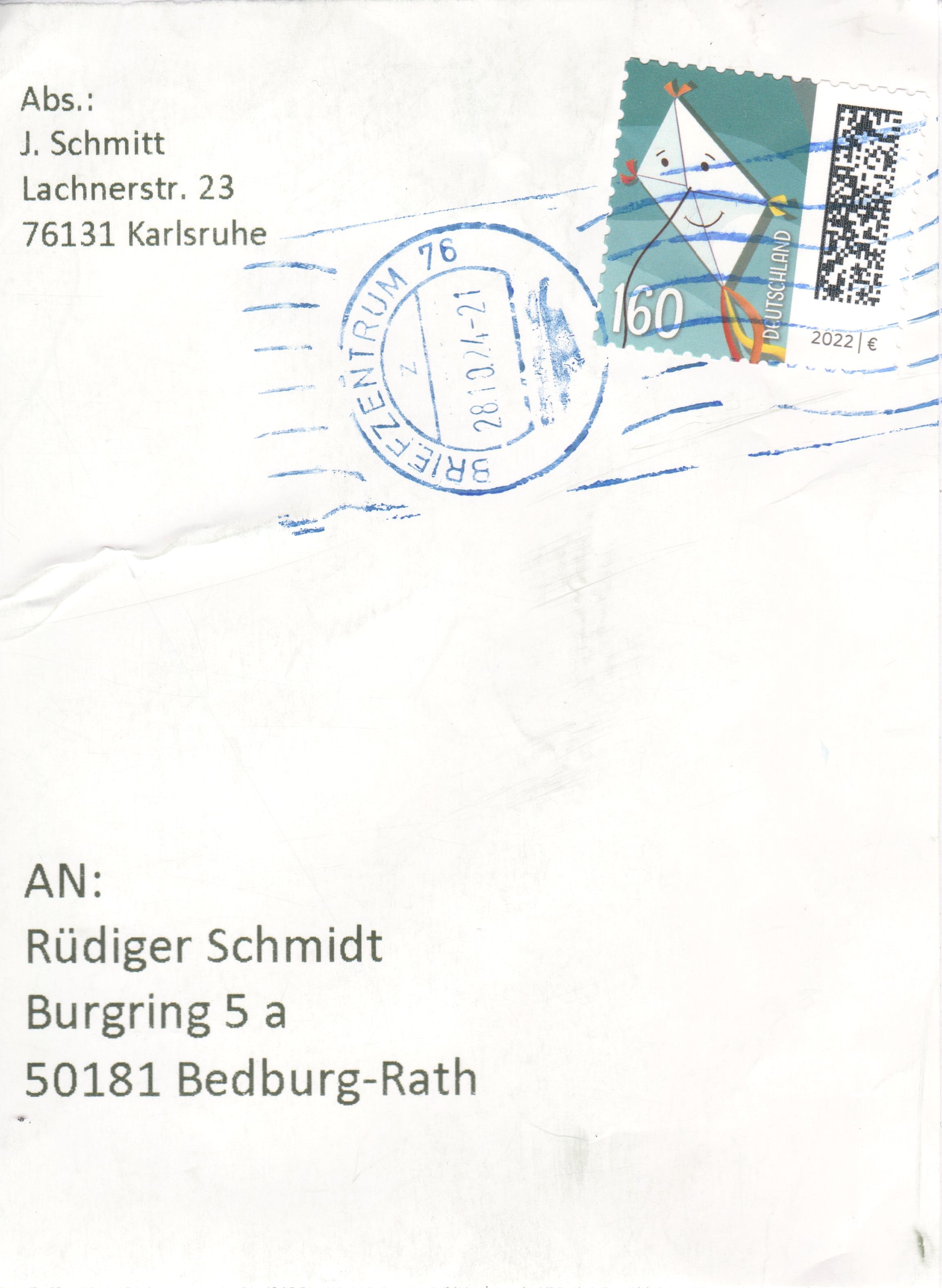 Briefausschnitt, Portostufe 1,60 €, entwertet am 28.10.2024 mit einem Handrollstempel BRIEFZENTRUM 76 = Karlsruhe: