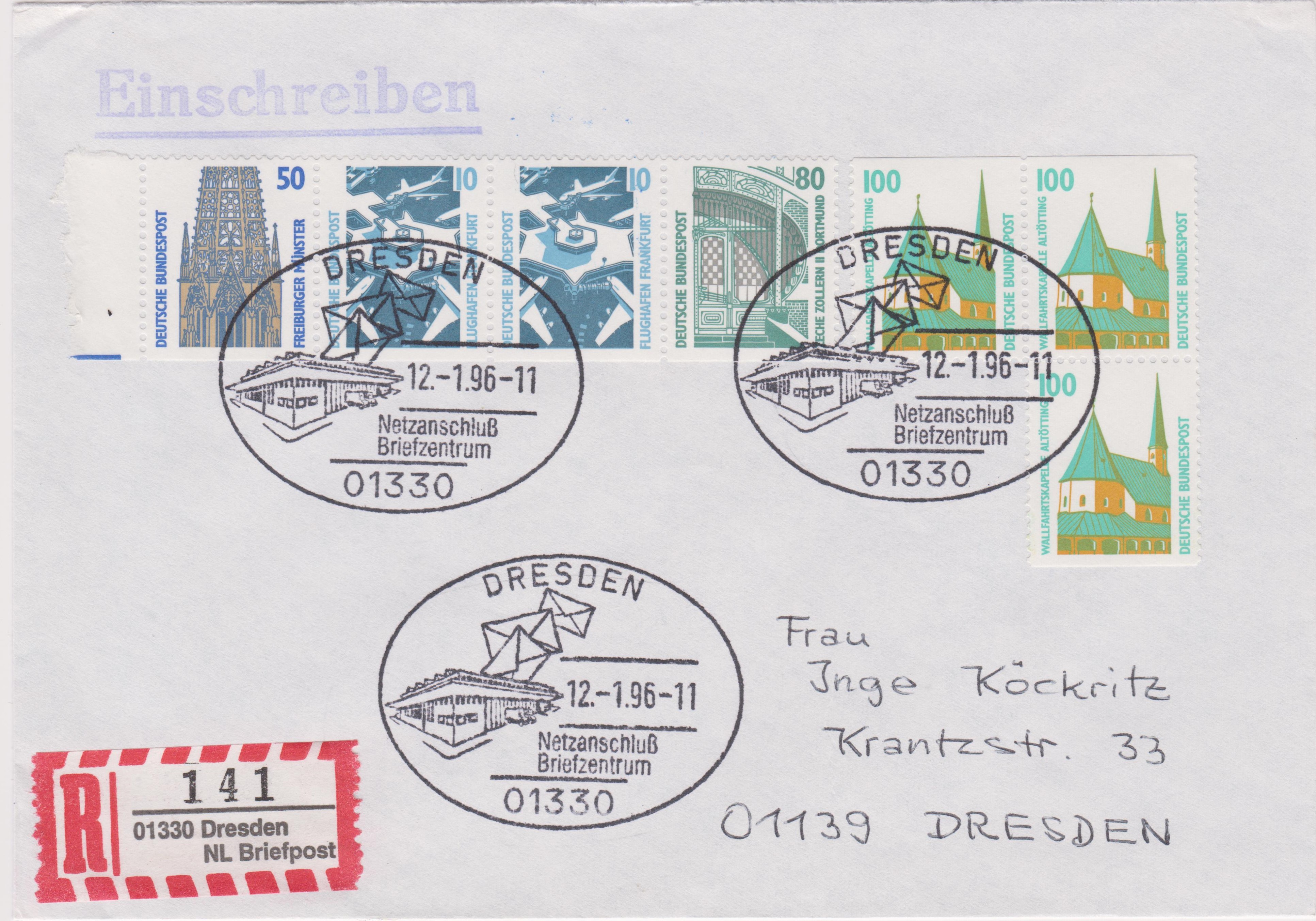 Der Netzanschluß des Briefzentrums 01 in 01330 DRESDEN erfolgte am 12.01.1996, was dieser Beleg per Sonderstempel dokumentiert: