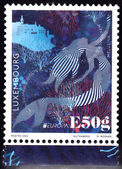 Die Europamarken 2022 sind in Luxemburg am 17. Mai 2022 zum Thema "Märchen, Mythen und Sagen" erschienen. Die Marke zum Tarif Brief Europa bis 50g 85 zeigt eine Darstellung zur luxemburgischen Sagenfigur "Melusina". Die Marke kostetet zum Zeitpunkt der Ausgabe 1,05€.
