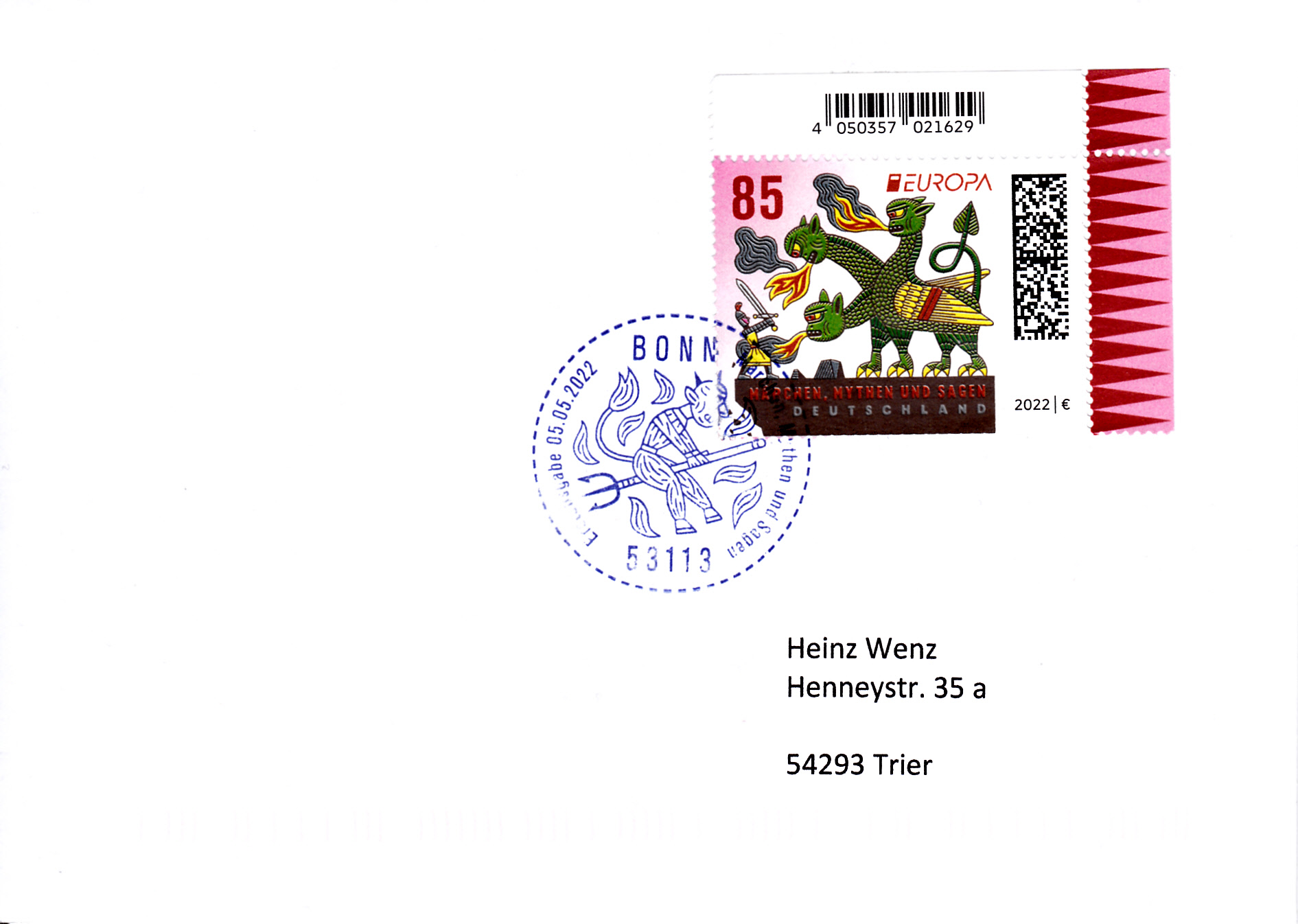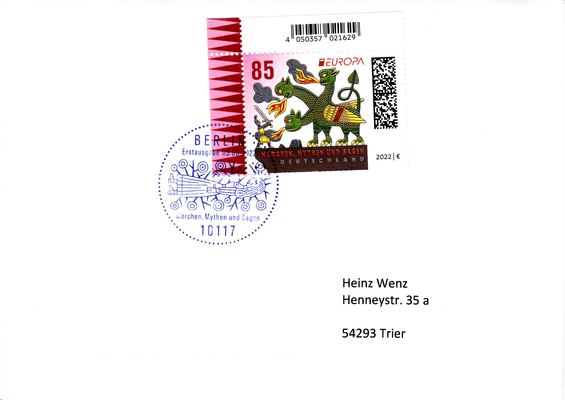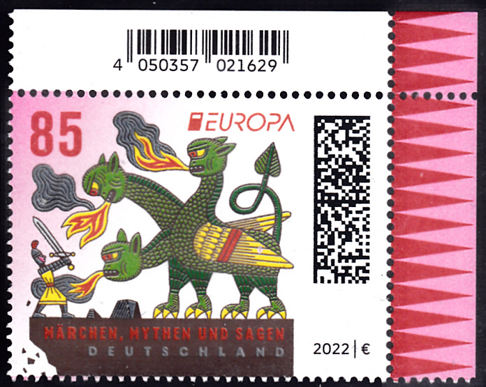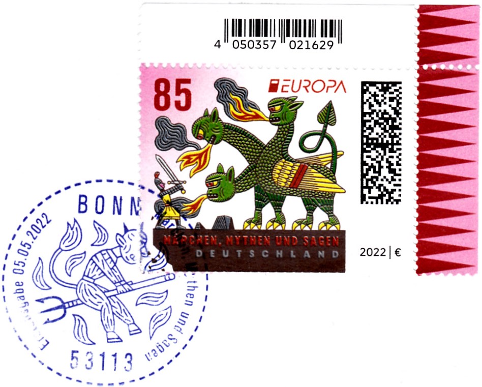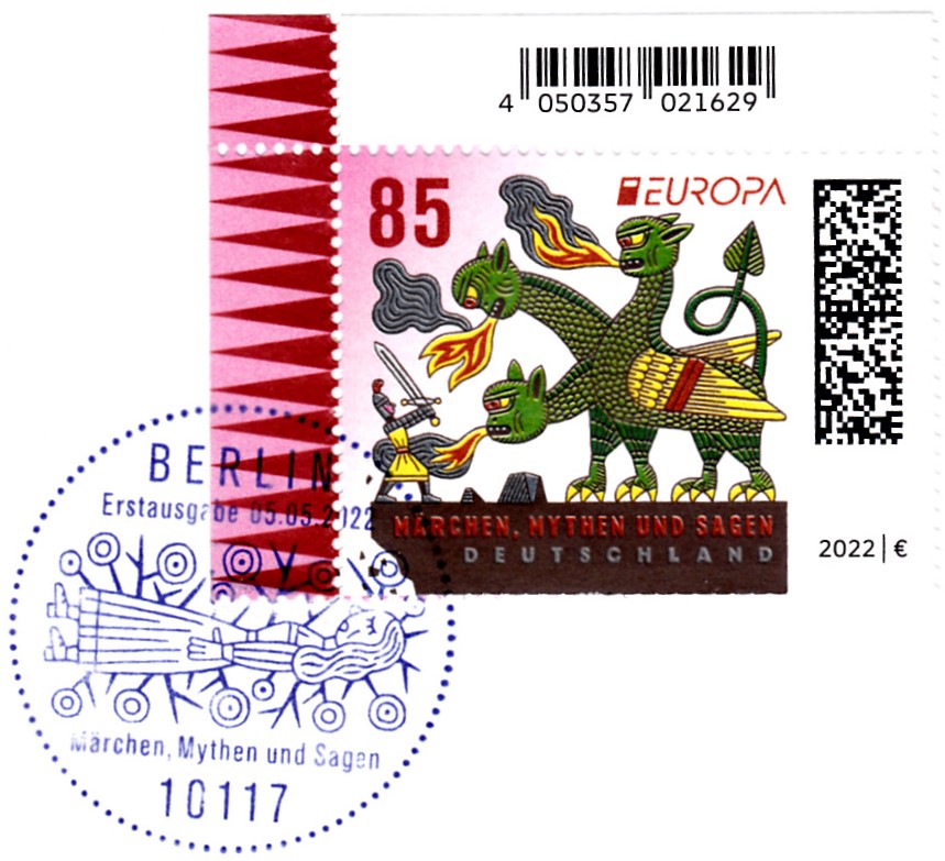 Die Europamarke 2022 ist bei der Deutschen Post am 5. Mai 2022 zum Thema "Märchen, Mythen und Sagen" erschienen. Die Marke zu 85 Cent zeigt die Darstellung "Ritter kämpft gegen dreiköpfigen Drachen".