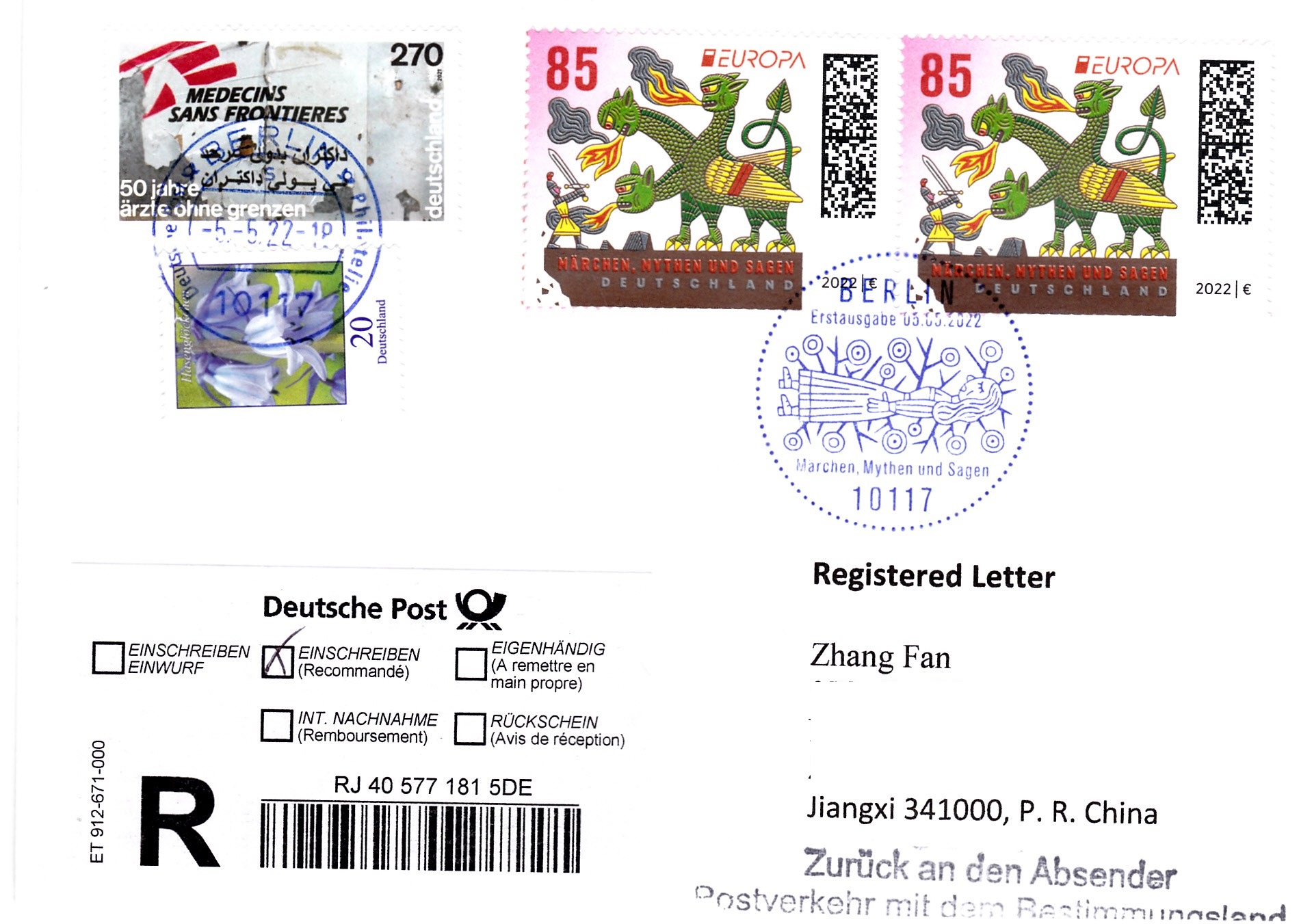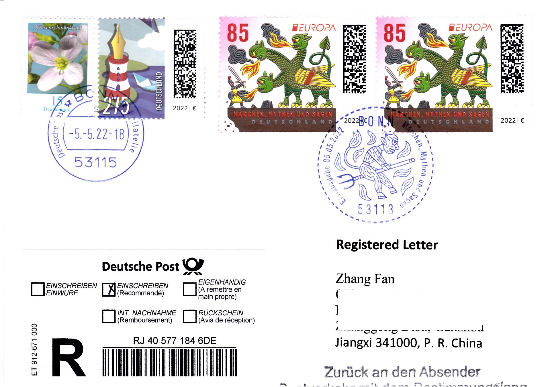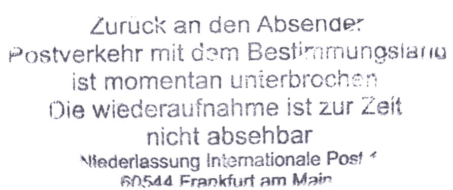 Der Brief wurde zum Absender zurückgeschickt, da der Versand von Einschreibebriefen in die Volksrepublik China zu dieser Zeit nicht möglich war. Es waren nicht alle Flughäfen in China wegen Corona-Beschränkungen erreichbar.