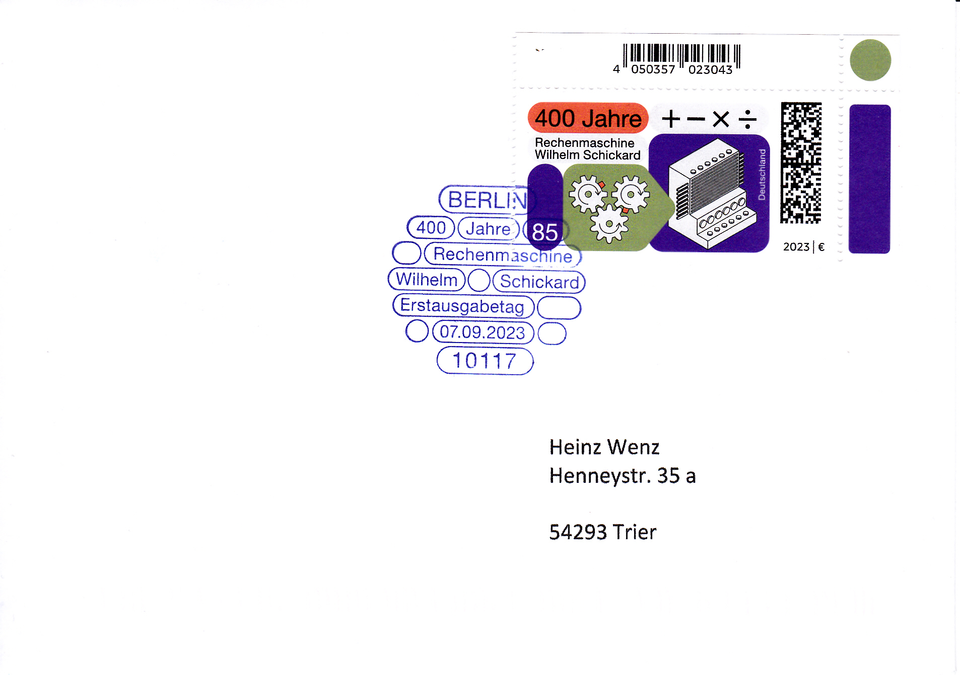 Bei der Deutschen Post erschien zur Erfindung der ersten mechanischen Rechenmaschine durch Wilhelm Schickard vor 400 Jahren diese Marke (MiNr 3786) mit Rechenzeichen, Zahnrädern und einem Bild der Rechenmaschine von Wilhelm Schickard.