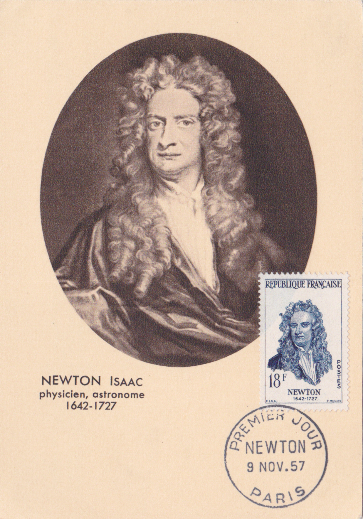 Sir Isaac Newton (geb. 25. Dez. 1642jul./4. Jan. 1643greg. in Woolsthorpe-by-Colsterworth in Lincolnshire; gest. 20. März 1726jul./31. März 1727greg. in Kensington) war ein englischer Universalgelehrter. Er wirkte an der Universität Cambridge, war verantwortlich für die Royal Mint und Präsident der Royal Society. Aufgrund seiner Leistungen auf den Gebieten der Physik und Mathematik gilt Newton als einer der bedeutendsten Naturwissenschaftler. Er war neben Gottfried Wilhelm Leibniz einer der Begründer der Infinitesimalrechnung und erbrachte wichtige Beiträge zur Algebra. Zu seinen frühesten Leistungen zählt eine verallgemeinerte Formulierung des Binomischen Lehrsatzes mit Hilfe von unendlichen Reihen. Er bewies, dass es für sämtliche reellen Zahlen (also auch negative und Brüche) gültig ist. Aus Frankreich kommt diese Marke (MiNr 1171) mit einem Porträt von Isaac Newton.