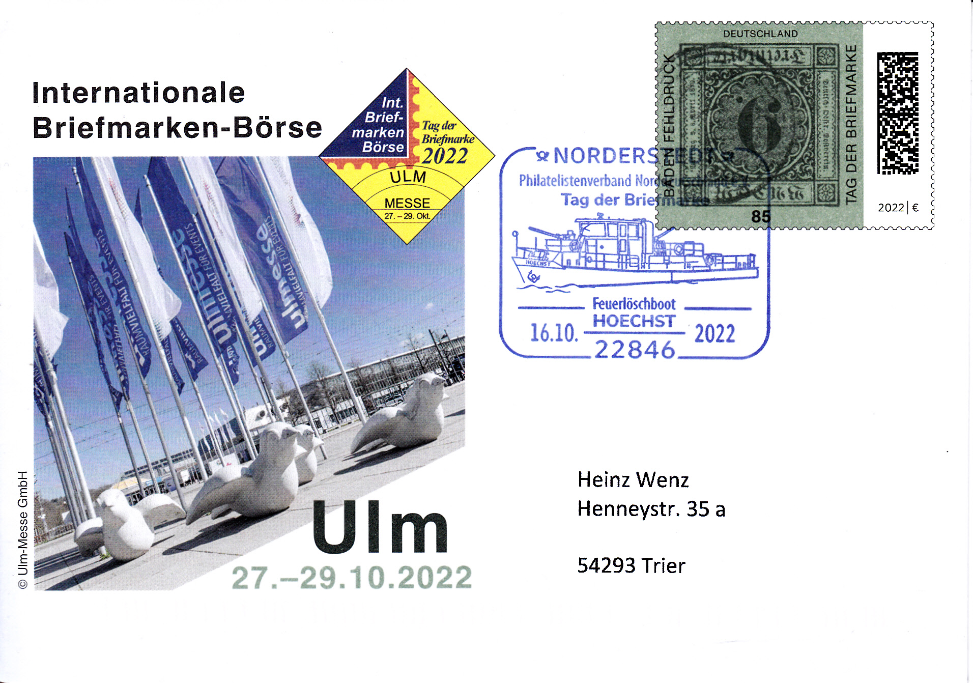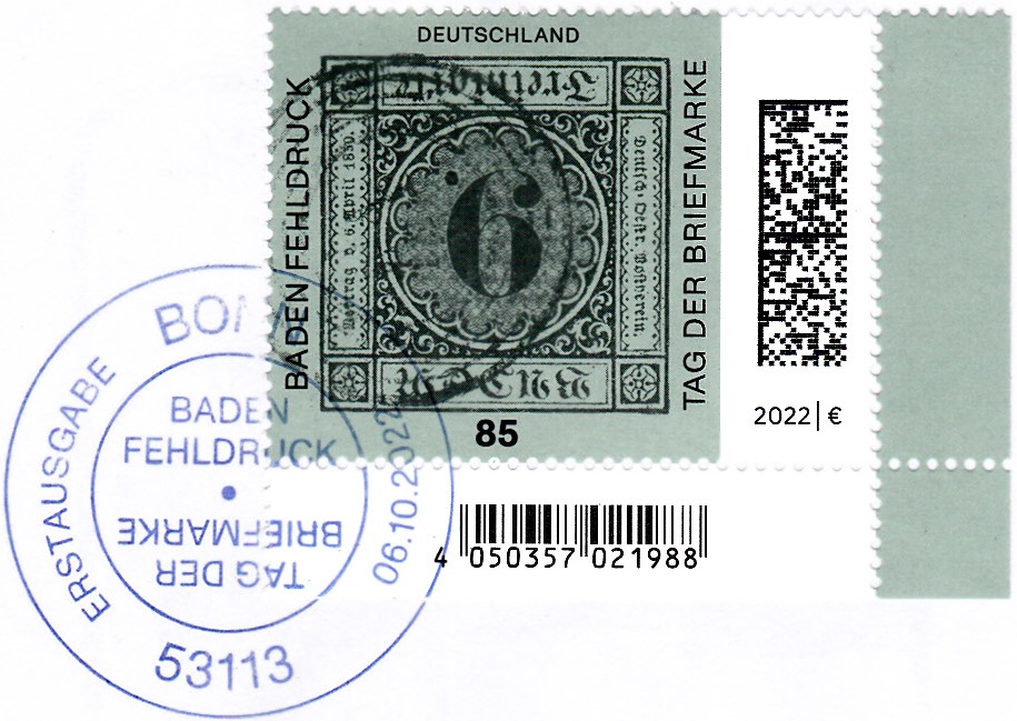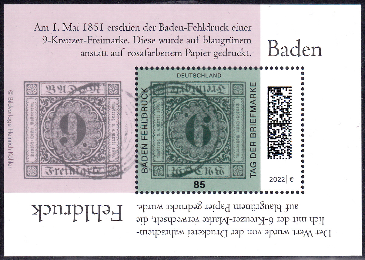 Zum Tag der Briefmarke 2021 ist bei der Deutschen Post eine Marke (MiNr 3719) mit dem Baden-Fehldruck MiNr. 4 F erschienen. Die Marke in schwarz auf blaugrünem statt lilarosa Papier, entwertet mit einem Fünfring-Nummernstempel "41", ist kopfstehend abgebildet.