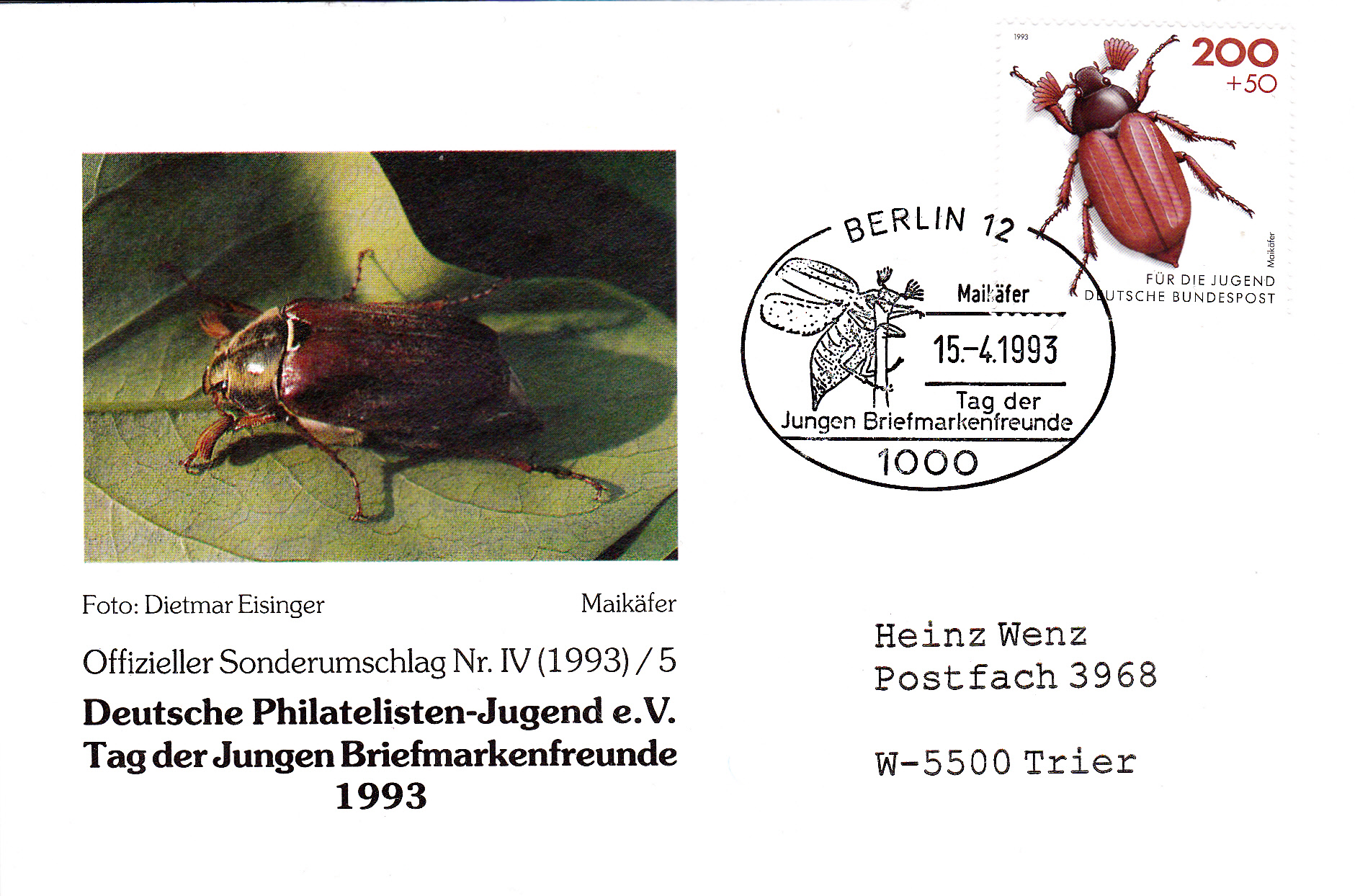 Die Jugendmarke mit dem Maikäfer wurde hier auf einem Brief am 15.4.1993, dem Ausgabetag der Marke, mit einem Sonderstempel aus Eitorf zum Tag der Jungen Briefmarkenfreunde gestempelt. Das Stempelbild zeigt ein Maikäferpärchen bei der Paarung.