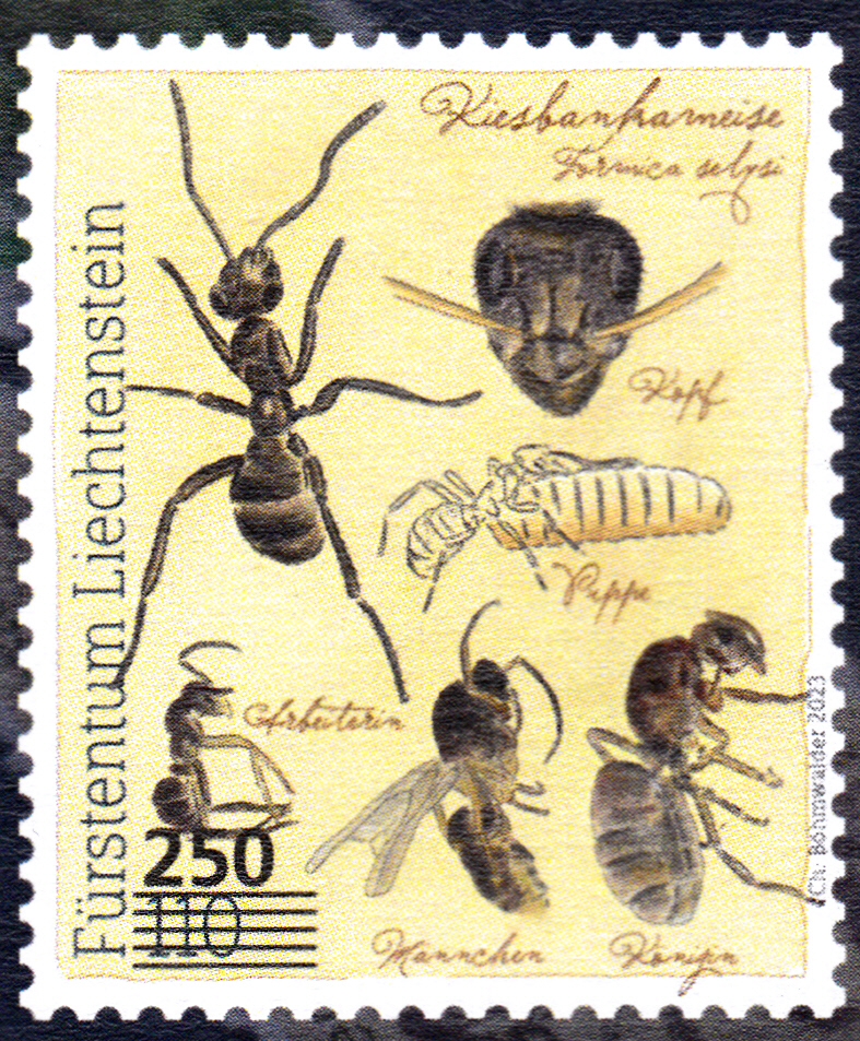 Eine Marke aus Liechtenstein (MiNr zeigt 2120) zeigt Abbildungen zum Thema Kiesbankameise (Formica selysi).