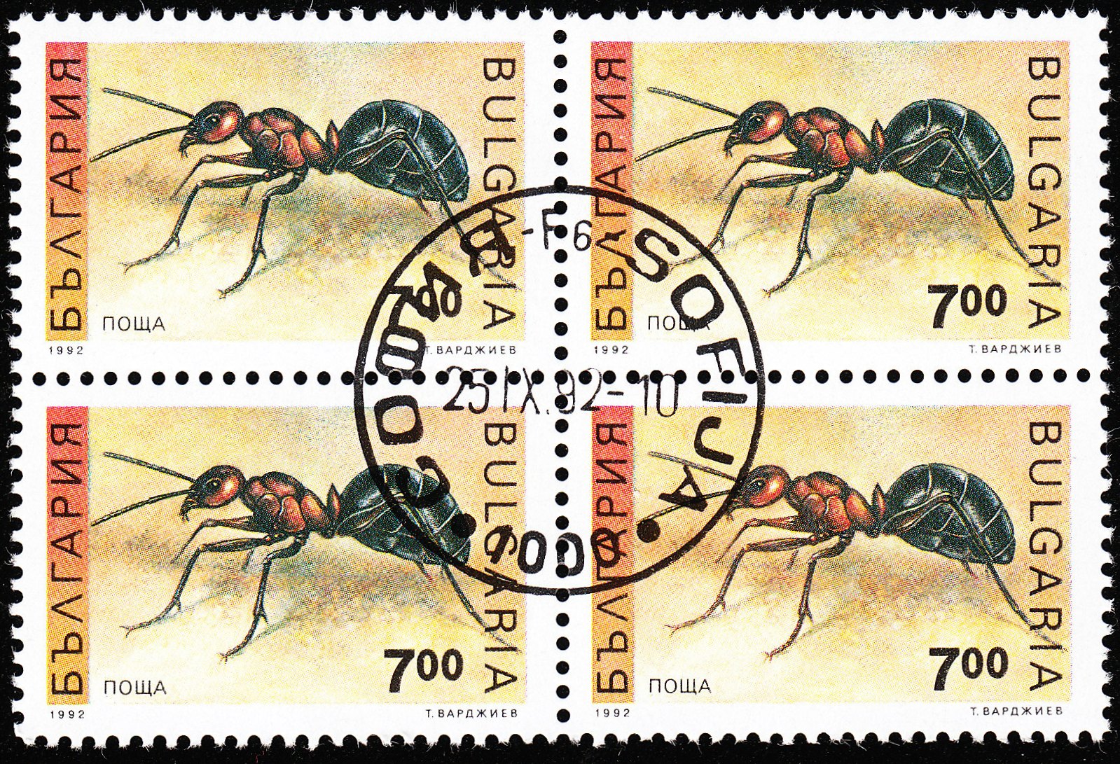 Diese am 25.09.1992 in einer Auflage von 4 000 000 Stück erschienene Briefmarke aus Bulgarien, MiNr. 3998, zeigt eine solche Rote Waldameise (Formica rufa) mit diesen Merkmalen, hier gleich im Viererblock gestempelt am 25.09.1992 als Erstausgabetag: