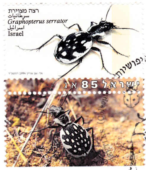 Aus Israel kommt diese Marke (MiNr 1287) mit einem Graphipterus serrator. Bei Michel wird der Name mit Sandlaufkäfer (Graphopterus serrator) angegeben!
