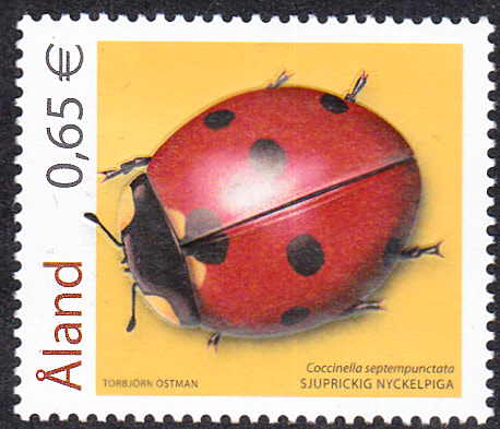 Auf dieser Marke der Alandinseln (MiNr 260) ist ein Siebenpunkt-Marienkäfer (Coccinella septempunctata) abgebildet. Die Marke ist im kombinierten Offsetdruck und Prägedruck hergestellt. Der Käfer ist "erhaben", Am Scan sieht man dies an der "Spiegelung" auf dem Käferrücken.