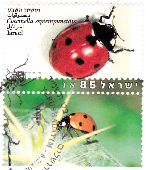 Einen weiteren Siebenpunkt-Marienkäfer (Coccinella septempunctata) kann ich auf dieser Marke mit Tab aus Israel (MiNr 1289) zeigen.