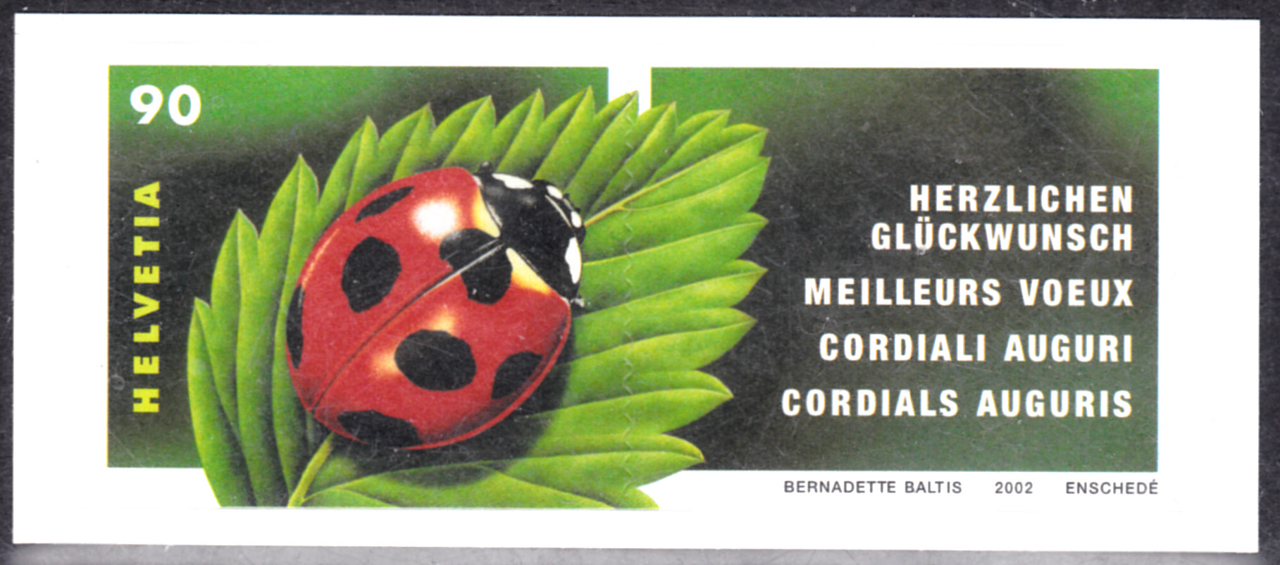 Aus der Schweiz kommt diese selbstklebende Einzelmarke mit Zierfeld (MiNr 1806 Zf). Sie zeigt einen Siebenpunkt-Marienkäfer (Coccinella septempunctata). Er wird auf bei diesem Zusammendruck als Glücksbringer dargestellt.