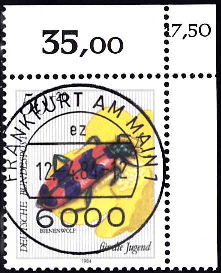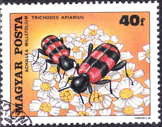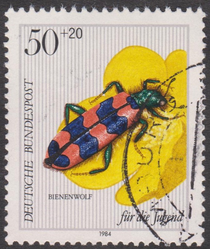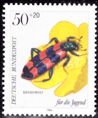 Auf der Jugendmarke zu 50+20Pf der Deutschen Bundespost (MiNr 1202) aus dem Jahre 1984 ist ein Gemeiner Bienenkäfer (Trichodes apiarius) zu sehen.