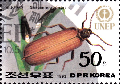 Diese Marke aus Nord-Korea (MiNr 3349) zeigt einen Scharlachroten Netzkäfer (Dictyoptera aurora).