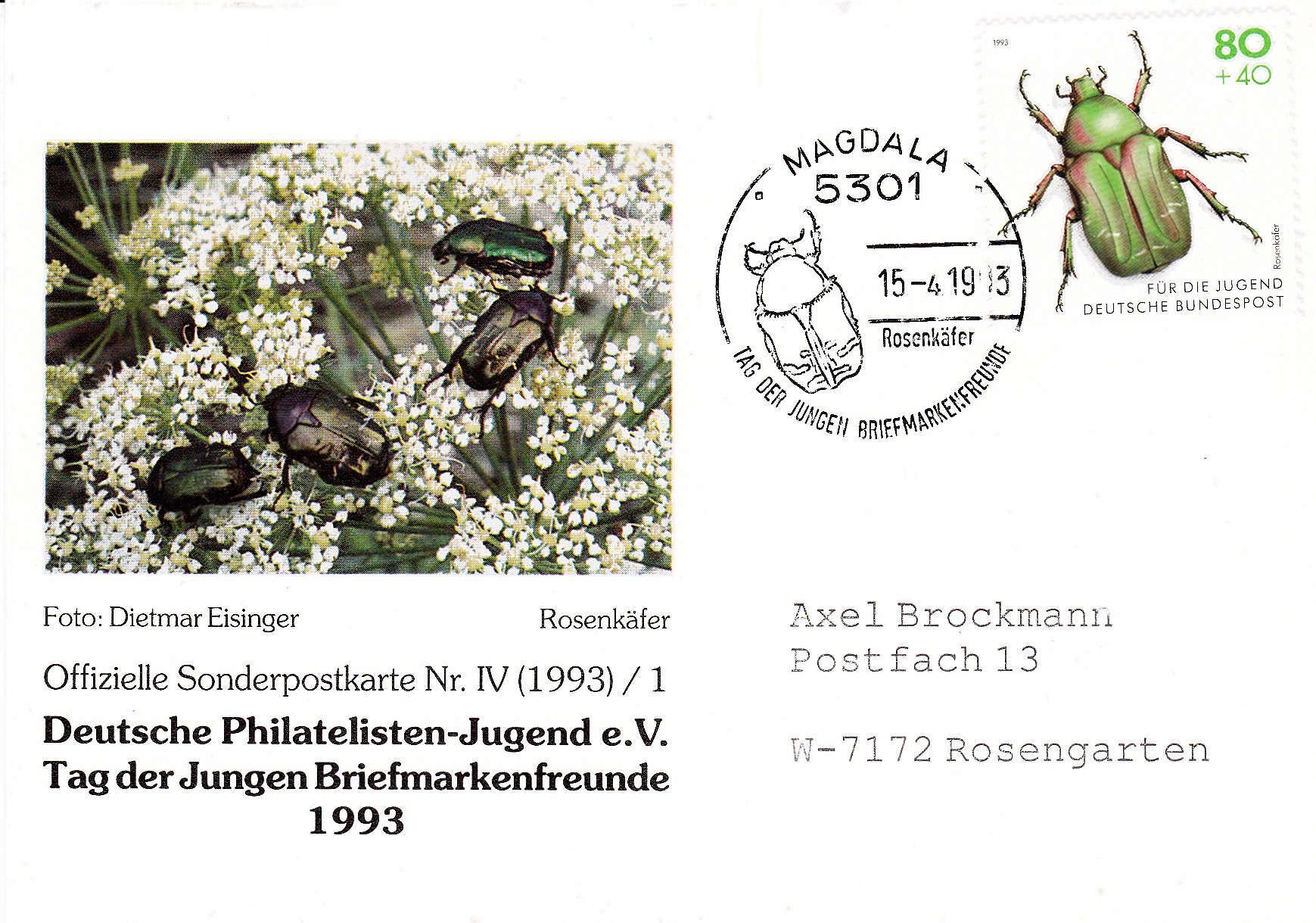 Die Jugendmarke mit dem Rosenkäfer wurde hier auf einer Postkarte am 15.4.1993, dem Ausgabetag der Marke, mit einem Sonderstempel aus Magdala zum Tag der Jungen Briefmarkenfreunde gestempelt. Das Stempelbild zeigt ebenfalls einen Rosenkäfer.