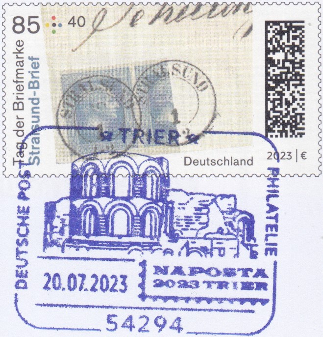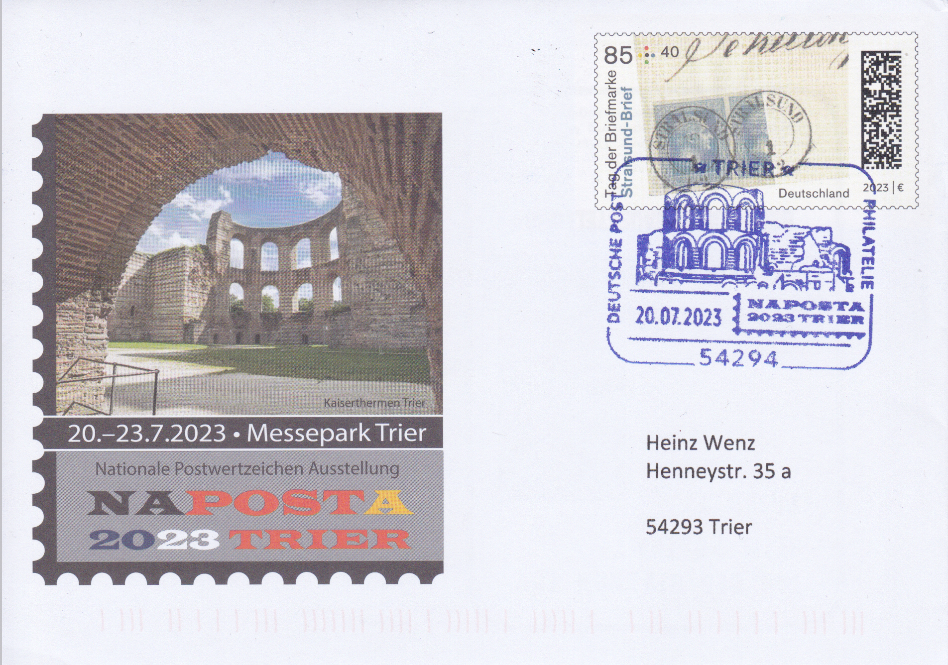 Messeganzsache zur NAPOSTA 2023 in Trier mit dem Sonderstempel vom 20.07.2023 aus Trier zur NAPOSTA 2023. Im Stempelbild sind ebenfalls die Kaiserthermen abgebildet.