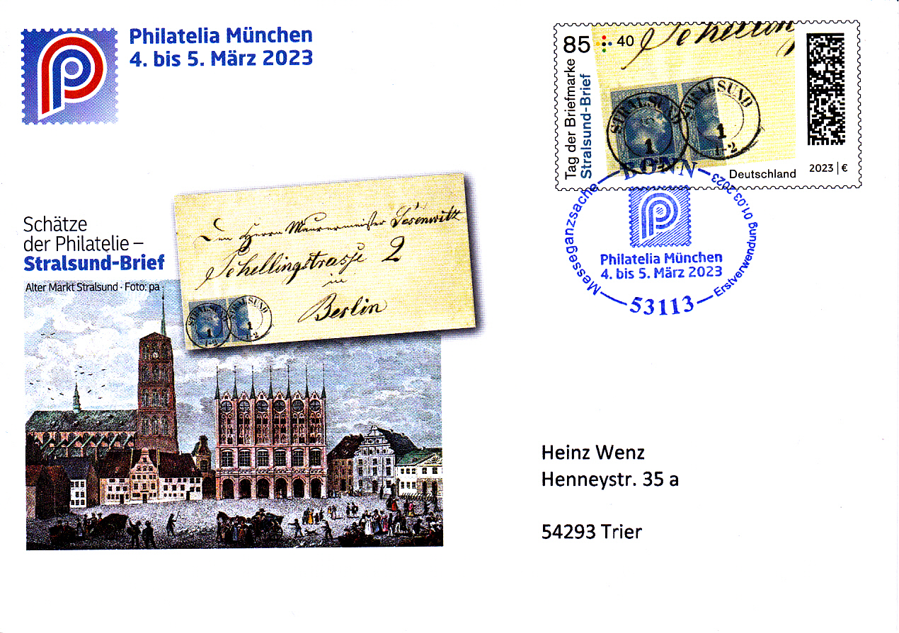 Am 1. März 2023 erschien bei der Deutschen Post eine Zuschlagsmarke (MiNr 3752) zum Tag der Briefmarke 2023. Als Motiv wurde der linke untere Ecke des Stralsund-Briefes mit einem 1,5er-Streifen der Preußen MiNr. 7 gewählt. Hier zeige ich eine Marke vom Eckrand mit EAN-Codierung.