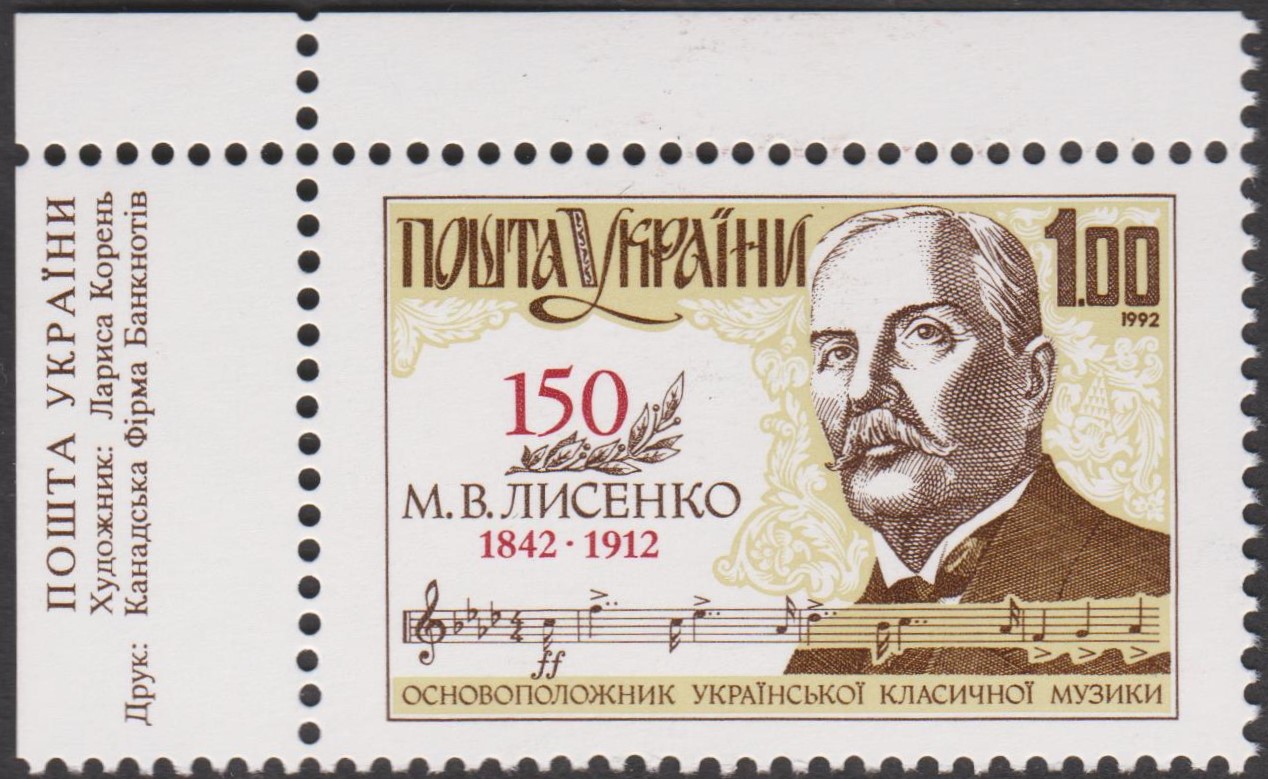 Am 22.03.1992 gab die Republik Ukraine zum "150. Geburtstag von Mykola Lyssenko" dieses Postwertzeichen, katalgisiert als Ukraine MiNr. 73, heraus: