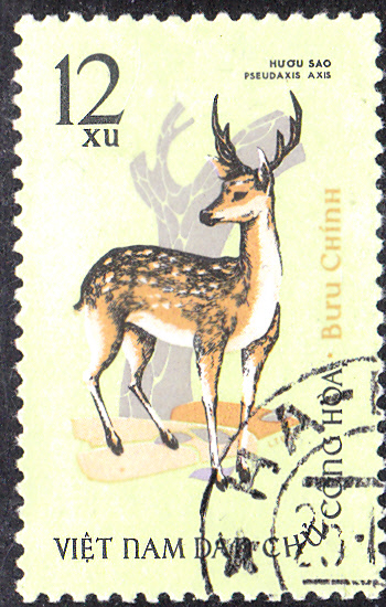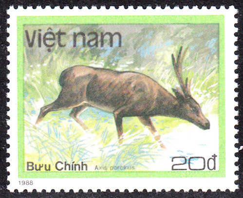 Auf dieser Marke aus Vietnam (MiNr 1984) ist ein Schweinshirsch (Axis porcinus) abgebildet.